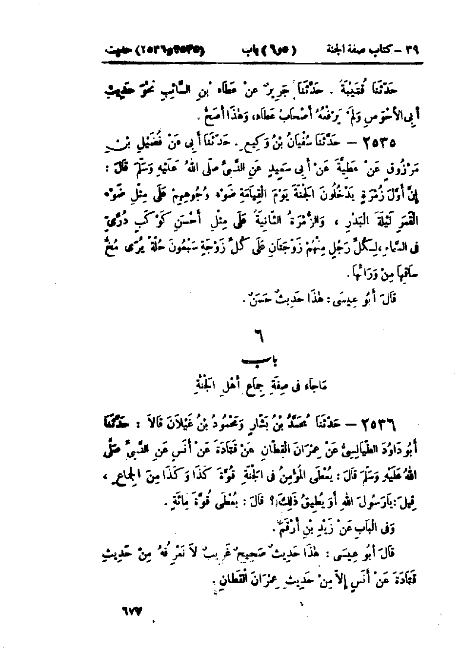 2535 - حَدَّثَنَا سُفْيَانُ بْنُ وَكِيعٍ قَالَ: حَدَّثَنَا أَبِي، عَنْ فُضَيْلِ بْنِ مَرْزُوقٍ، عَنْ عَطِيَّةَ، عَنْ أَبِي سَعِيدٍ، عَنِ النَّبِيِّ صَلَّى اللَّهُ عَلَيْهِ وَسَلَّمَ قَالَ: «إِنَّ §أَوَّلَ زُمْرَةٍ يَدْخُلُونَ الجَنَّةَ يَوْمَ القِيَامَةِ ضَوْءُ وُجُوهِهِمْ عَلَى مِثْلِ ضَوْءِ القَمَرِ لَيْلَةَ البَدْرِ، وَالزُّمْرَةُ الثَّانِيَةُ عَلَى مِثْلِ أَحْسَنِ كَوْكَبٍ دُرِّيٍّ فِي السَّمَاءِ، لِكُلِّ رَجُلٍ مِنْهُمْ زَوْجَتَانِ عَلَى كُلِّ زَوْجَةٍ سَبْعُونَ حُلَّةً يُرَى مُخُّ سَاقِهَا مِنْ وَرَائِهَا»: «هَذَا حَدِيثٌ حَسَنٌ صَحِيحٌ»