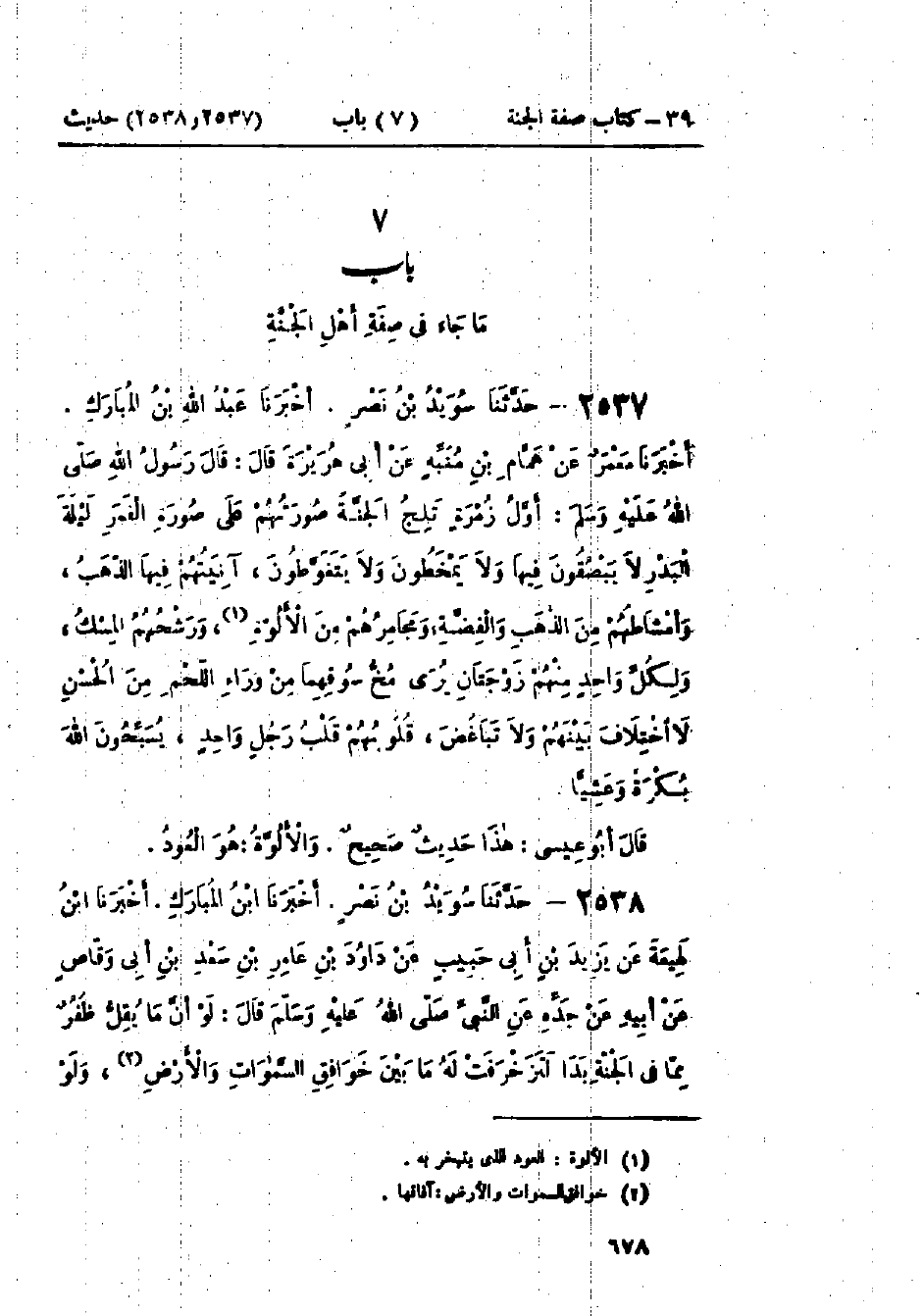 2537 - حَدَّثَنَا سُوَيْدُ بْنُ نَصْرٍ قَالَ: أَخْبَرَنَا عَبْدُ اللَّهِ بْنُ المُبَارَكِ قَالَ: أَخْبَرَنَا مَعْمَرٌ، عَنْ هَمَّامِ بْنِ مُنَبِّهٍ، عَنْ أَبِي هُرَيْرَةَ، قَالَ: قَالَ رَسُولُ اللَّهِ صَلَّى اللَّهُ عَلَيْهِ وَسَلَّمَ: «§أَوَّلُ زُمْرَةٍ تَلِجُ الجَنَّةَ صُورَتُهُمْ عَلَى صُورَةِ القَمَرِ لَيْلَةَ البَدْرِ لَا يَبْصُقُونَ فِيهَا وَلَا يَمْخُطُونَ وَلَا يَتَغَوَّطُونَ، آنِيَتُهُمْ فِيهَا الذَّهَبُ، وَأَمْشَاطُهُمْ مِنَ الذَّهَبِ وَالفِضَّةِ، وَمَجَامِرُهُمْ مِنَ الأُلُوَّةِ، وَرَشْحُهُمُ المِسْكُ، وَلِكُلِّ وَاحِدٍ مِنْهُمْ زَوْجَتَانِ يُرَى مُخُّ سُوقِهِمَا مِنْ وَرَاءِ اللَّحْمِ مِنَ الحُسْنِ لَا اخْتِلَافَ بَيْنَهُمْ وَلَا تَبَاغُضَ، قُلُوبُهُمْ قَلْبُ رَجُلٍ وَاحِدٍ، يُسَبِّحُونَ اللَّهَ بُكْرَةً وَعَشِيًّا»: " هَذَا حَدِيثٌ صَحِيحٌ وَالأُلُوَّةُ: هُوَ العُودُ "