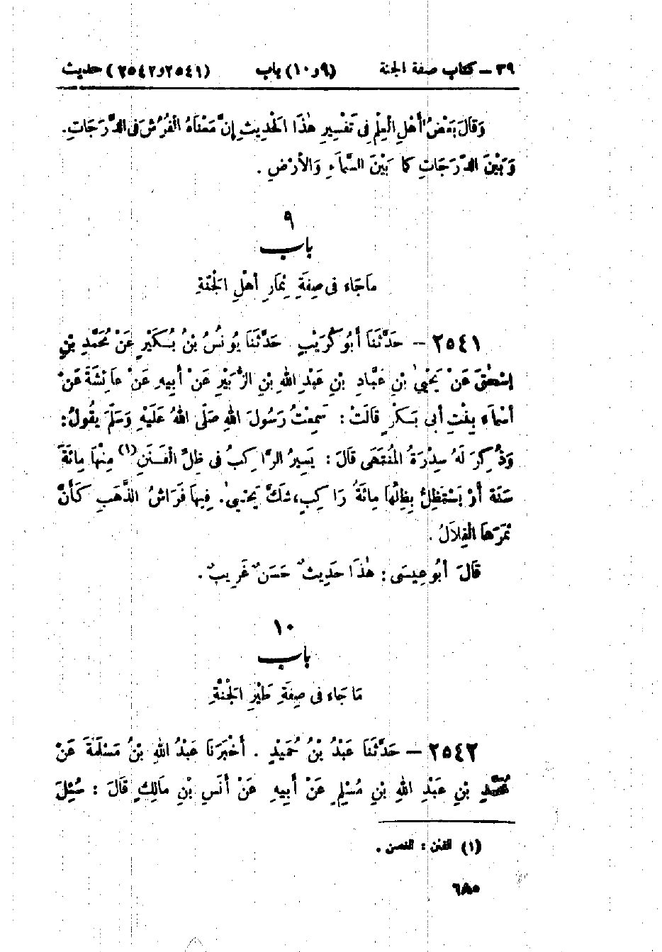 2541 - حَدَّثَنَا أَبُو كُرَيْبٍ قَالَ: حَدَّثَنَا يُونُسُ بْنُ بُكَيْرٍ، عَنْ مُحَمَّدِ بْنِ إِسْحَاقَ، عَنْ يَحْيَى بْنِ عَبَّادِ بْنِ عَبْدِ اللَّهِ بْنِ الزُّبَيْرِ، عَنْ أَبِيهِ، عَنْ أَسْمَاءَ بِنْتِ أَبِي بَكْرٍ، قَالَتْ: سَمِعْتُ رَسُولَ اللَّهِ صَلَّى اللَّهُ عَلَيْهِ وَسَلَّمَ، وَذَكَرَ سِدْرَةَ الْمُنْتَهَى، قَالَ: «§يَسِيرُ الرَّاكِبُ فِي ظِلِّ الفَنَنِ مِنْهَا مِائَةَ سَنَةٍ، أَوْ يَسْتَظِلُّ بِظِلِّهَا مِائَةُ رَاكِبٍ - شَكَّ يَحْيَى - فِيهَا فِرَاشُ الذَّهَبِ كَأَنَّ ثَمَرَهَا الْقِلَالُ». هَذَا حَدِيثٌ حَسَنٌ صَحِيحٌ غَرِيبٌ