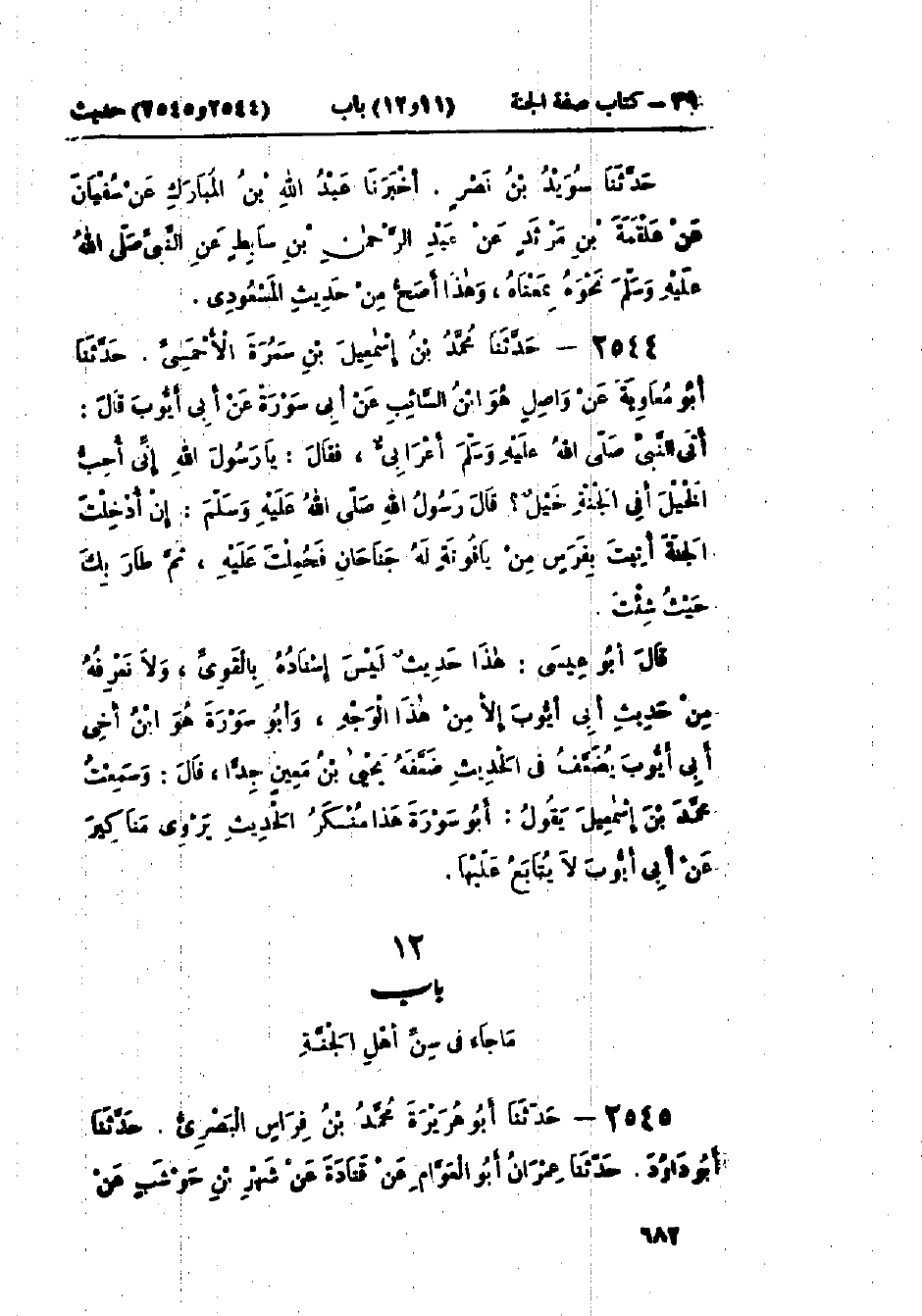 2544 - حَدَّثَنَا مُحَمَّدُ بْنُ إِسْمَاعِيلَ بْنِ سَمُرَةَ الأَحْمَسِيُّ قَالَ: حَدَّثَنَا أَبُو مُعَاوِيَةَ، عَنْ وَاصِلٍ هُوَ ابْنُ السَّائِبِ، عَنْ أَبِي سَوْرَةَ، عَنْ أَبِي أَيُّوبَ، قَالَ: أَتَى النَّبِيَّ صَلَّى اللَّهُ عَلَيْهِ وَسَلَّمَ أَعْرَابِيٌّ، فَقَالَ: يَا رَسُولَ اللَّهِ إِنِّي أُحِبُّ الخَيْلَ، أَفِي الجَنَّةِ خَيْلٌ؟ قَالَ رَسُولُ اللَّهِ صَلَّى اللَّهُ عَلَيْهِ وَسَلَّمَ: «§إِنْ أُدْخِلْتَ الجَنَّةَ أُتِيتَ بِفَرَسٍ مِنْ يَاقُوتَةٍ لَهُ جَنَاحَانِ فَحُمِلْتَ عَلَيْهِ، ثُمَّ طَارَ بِكَ حَيْثُ شِئْتَ»: «هَذَا حَدِيثٌ لَيْسَ إِسْنَادُهُ بِالقَوِيِّ، وَلَا نَعْرِفُهُ مِنْ حَدِيثِ أَبِي أَيُّوبَ إِلَّا مِنْ هَذَا الوَجْهِ» وَأَبُو سَوْرَةَ هُوَ: ابْنُ أَخِي أَبِي أَيُّوبَ يُضَعَّفُ فِي الحَدِيثِ، ضَعَّفَهُ يَحْيَى بْنُ مَعِينٍ جِدًّا " وَسَمِعْتُ مُحَمَّدَ بْنَ إِسْمَاعِيلَ، يَقُولُ: «أَبُو سَوْرَةَ هَذَا مُنْكَرُ الحَدِيثِ يَرْوِي مَنَاكِيرَ عَنْ أَبِي أَيُّوبَ لَا يُتَابَعُ عَلَيْهَا»