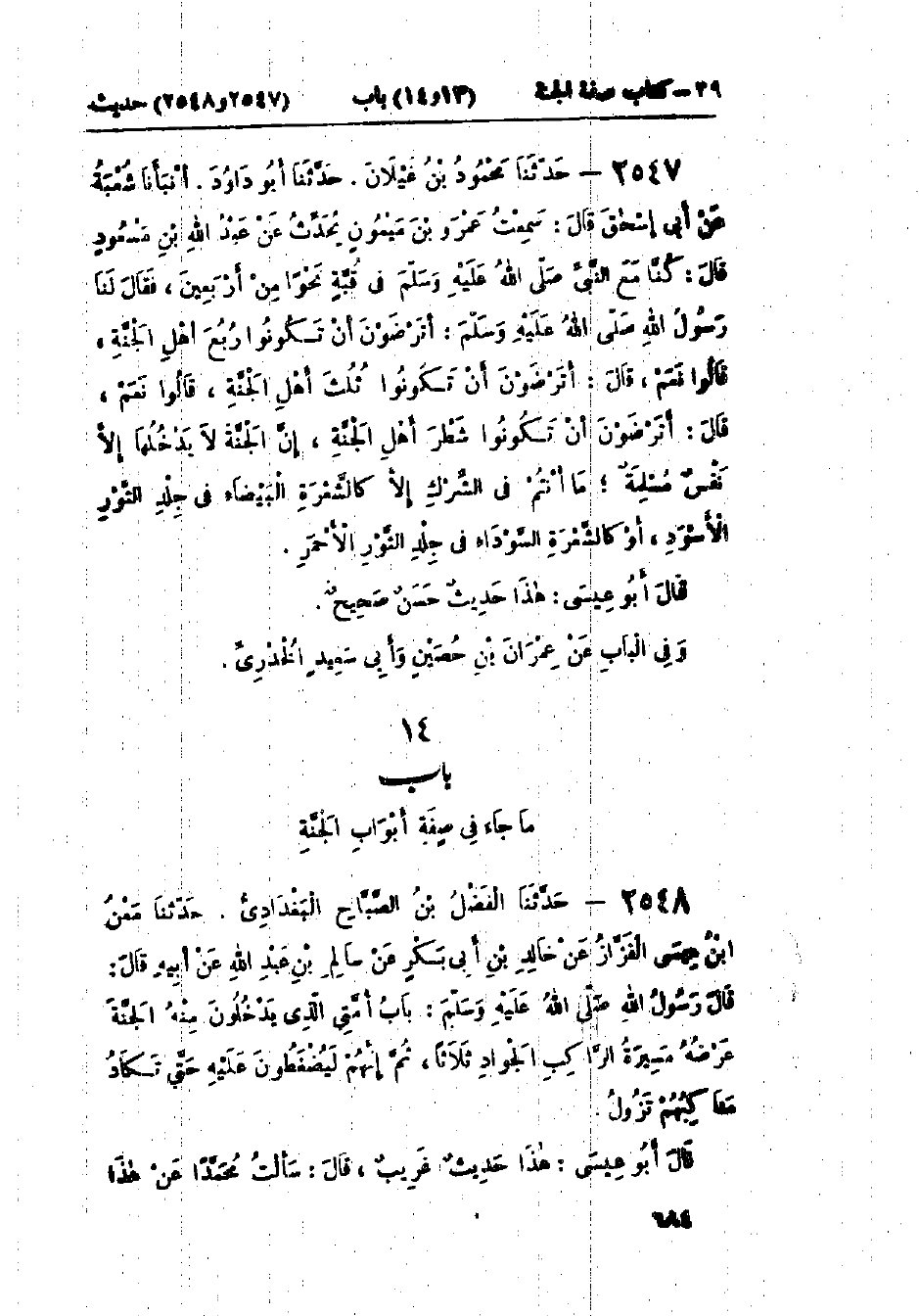 2547 - حَدَّثَنَا مَحْمُودُ بْنُ غَيْلَانَ قَالَ: حَدَّثَنَا أَبُو دَاوُدَ قَالَ: حَدَّثَنَا شُعْبَةُ، عَنْ أَبِي إِسْحَاقَ، قَالَ: سَمِعْتُ عَمْرَو بْنَ مَيْمُونٍ يُحَدِّثُ، عَنْ عَبْدِ اللَّهِ بْنِ مَسْعُودٍ، قَالَ: كُنَّا مَعَ النَّبِيِّ صَلَّى اللَّهُ عَلَيْهِ وَسَلَّمَ فِي قُبَّةٍ نَحْوًا مِنْ أَرْبَعِينَ، فَقَالَ لَنَا رَسُولُ اللَّهِ صَلَّى اللَّهُ عَلَيْهِ وَسَلَّمَ: «§أَتَرْضَوْنَ أَنْ تَكُونُوا رُبُعَ أَهْلِ الجَنَّةِ»، قَالُوا: نَعَمْ، قَالَ: «أَتَرْضَوْنَ أَنْ تَكُونُوا ثُلُثَ أَهْلِ الجَنَّةِ»، قَالُوا: نَعَمْ، قَالَ: «أَتَرْضَوْنَ أَنْ تَكُونُوا شَطْرَ أَهْلِ الجَنَّةِ، إِنَّ الجَنَّةَ لَا يَدْخُلُهَا إِلَّا نَفْسٌ مُسْلِمَةٌ، مَا أَنْتُمْ فِي الشِّرْكِ إِلَّا كَالشَّعْرَةِ البَيْضَاءِ فِي جِلْدِ الثَّوْرِ الأَسْوَدِ، أَوْ كَالشَّعْرَةِ السَّوْدَاءِ فِي جِلْدِ الثَّوْرِ الأَحْمَرِ»: «هَذَا حَدِيثٌ حَسَنٌ صَحِيحٌ» وَفِي البَابِ عَنْ عِمْرَانَ بْنِ حُصَيْنٍ، وَأَبِي سَعِيدٍ الخُدْرِيِّ