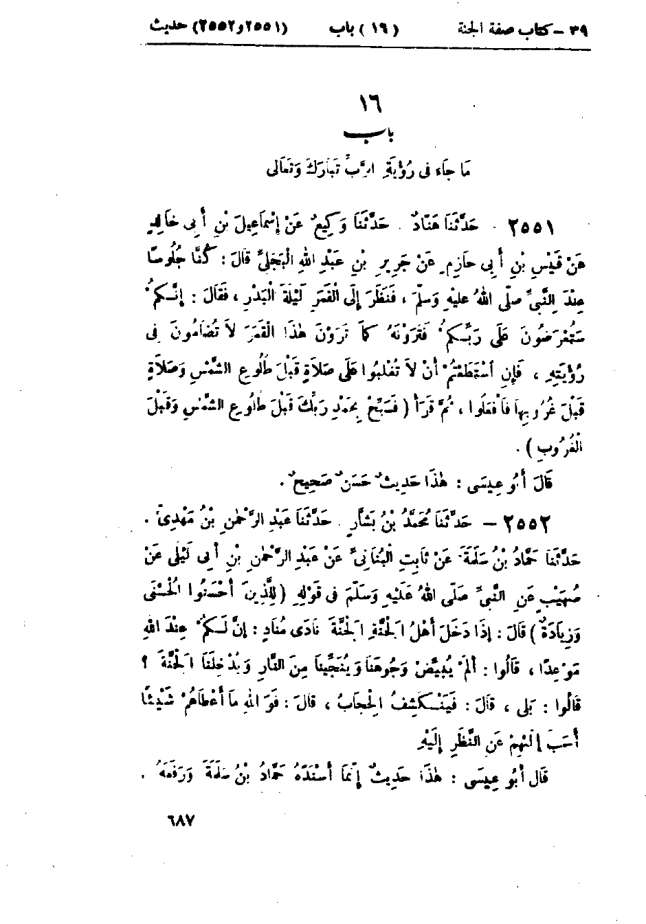 2551 - حَدَّثَنَا هَنَّادٌ قَالَ: حَدَّثَنَا وَكِيعٌ، عَنْ إِسْمَاعِيلَ بْنِ أَبِي خَالِدٍ، عَنْ قَيْسِ بْنِ أَبِي حَازِمٍ، عَنْ جَرِيرِ بْنِ عَبْدِ اللَّهِ البَجَلِيِّ، قَالَ: كُنَّا جُلُوسًا عِنْدَ النَّبِيِّ صَلَّى اللَّهُ عَلَيْهِ وَسَلَّمَ فَنَظَرَ إِلَى القَمَرِ لَيْلَةَ البَدْرِ، فَقَالَ: «§إِنَّكُمْ سَتُعْرَضُونَ عَلَى رَبِّكُمْ فَتَرَوْنَهُ كَمَا تَرَوْنَ هَذَا القَمَرَ لَا تُضَامُونَ فِي رُؤْيَتِهِ، فَإِنْ اسْتَطَعْتُمْ أَنْ لَا تُغْلَبُوا عَلَى صَلَاةٍ قَبْلَ طُلُوعِ الشَّمْسِ وَصَلَاةٍ قَبْلَ غُرُوبِهَا فَافْعَلُوا»، ثُمَّ قَرَأَ: {وَسَبِّحْ بِحَمْدِ رَبِّكَ قَبْلَ طُلُوعِ الشَّمْسِ وَقَبْلَ الْغُرُوبِ} [ق: 39]: «هَذَا حَدِيثٌ صَحِيحٌ»