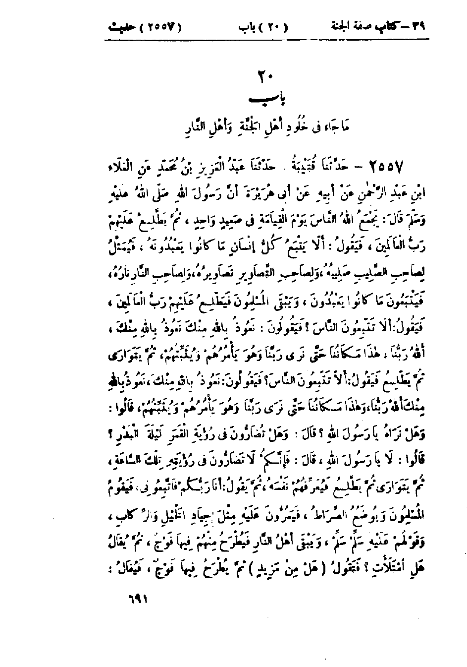 2557 - حَدَّثَنَا قُتَيْبَةُ قَالَ: حَدَّثَنَا عَبْدُ العَزِيزِ بْنُ مُحَمَّدٍ، عَنْ العَلَاءِ بْنِ عَبْدِ الرَّحْمَنِ، عَنْ أَبِيهِ، عَنْ أَبِي هُرَيْرَةَ، أَنَّ رَسُولَ اللَّهِ صَلَّى اللَّهُ عَلَيْهِ وَسَلَّمَ قَالَ: " يَجْمَعُ اللَّهُ النَّاسَ يَوْمَ القِيَامَةِ فِي صَعِيدٍ وَاحِدٍ، ثُمَّ يَطَّلِعُ عَلَيْهِمْ رَبُّ العَالَمِينَ، فَيَقُولُ: §أَلَا يَتْبَعُ كُلُّ إِنْسَانٍ مَا كَانُوا يَعْبُدُونَ، فَيُمَثَّلُ لِصَاحِبِ الصَّلِيبِ صَلِيبُهُ، وَلِصَاحِبِ التَّصَاوِيرِ تَصَاوِيرُهُ، وَلِصَاحِبِ النَّارِ نَارُهُ، فَيَتْبَعُونَ مَا كَانُوا يَعْبُدُونَ، وَيَبْقَى المُسْلِمُونَ فَيَطَّلِعُ عَلَيْهِمْ رَبُّ العَالَمِينَ، فَيَقُولُ: أَلَا تَتَّبِعُونَ النَّاسَ؟ فَيَقُولُونَ: نَعُوذُ بِاللَّهِ مِنْكَ نَعُوذُ بِاللَّهِ مِنْكَ، اللَّهُ رَبُّنَا، وَهَذَا مَكَانُنَا حَتَّى نَرَى رَبَّنَا وَهُوَ يَأْمُرُهُمْ وَيُثَبِّتُهُمْ، ثُمَّ يَتَوَارَى ثُمَّ يَطَّلِعُ فَيَقُولُ: أَلَا تَتَّبِعُونَ النَّاسَ؟ فَيَقُولُونَ: نَعُوذُ بِاللَّهِ مِنْكَ، نَعُوذُ بِاللَّهِ مِنْكَ اللَّهُ رَبُّنَا، وَهَذَا مَكَانُنَا حَتَّى نَرَى رَبَّنَا وَهُوَ يَأْمُرُهُمْ وَيُثَبِّتُهُمْ " قَالُوا: وَهَلْ نَرَاهُ يَا رَسُولَ اللَّهِ؟ قَالَ: «وَهَلْ تُضَارُّونَ فِي رُؤْيَةِ القَمَرِ لَيْلَةَ البَدْرِ»؟ قَالُوا: لَا يَا رَسُولَ اللَّهِ، قَالَ: " فَإِنَّكُمْ لَا تُضَارُّونَ فِي رُؤْيَتِهِ تِلْكَ السَّاعَةَ، ثُمَّ يَتَوَارَى ثُمَّ يَطَّلِعُ فَيُعَرِّفُهُمْ نَفْسَهُ، ثُمَّ يَقُولُ: أَنَا رَبُّكُمْ فَاتَّبِعُونِي، فَيَقُومُ المُسْلِمُونَ وَيُوضَعُ الصِّرَاطُ، فَيَمُرُّونَ عَلَيْهِ مِثْلَ جِيَادِ الخَيْلِ وَالرِّكَابِ، وَقَوْلُهُمْ عَلَيْهِ سَلِّمْ سَلِّمْ، وَيَبْقَى أَهْلُ النَّارِ فَيُطْرَحُ مِنْهُمْ فِيهَا فَوْجٌ، ثُمَّ يُقَالُ: هَلْ امْتَلَأْتِ؟ فَتَقُولُ: {هَلْ مِنْ مَزِيدٍ} [ق: 30] ثُمَّ يُطْرَحُ فِيهَا فَوْجٌ، فَيُقَالُ: -[692]- هَلْ امْتَلَأْتِ؟ فَتَقُولُ: {هَلْ مِنْ مَزِيدٍ} [ق: 30]، حَتَّى إِذَا أُوعِبُوا فِيهَا وَضَعَ الرَّحْمَنُ قَدَمَهُ فِيهَا وَأَزْوَى بَعْضَهَا إِلَى بَعْضٍ، ثُمَّ قَالَ: قَطْ، قَالَتْ: قَطْ قَطْ، فَإِذَا أَدْخَلَ اللَّهُ أَهْلَ الجَنَّةِ الجَنَّةَ وَأَهْلَ النَّارِ النَّارَ، قَالَ: أُتِيَ بِالمَوْتِ مُلَبَّبًا، فَيُوقَفُ عَلَى السُّورِ الَّذِي بَيْنَ أَهْلِ الْجَنَّةِ وَأَهْلِ النَّارِ، ثُمَّ يُقَالُ: يَا أَهْلَ الجَنَّةِ، فَيَطَّلِعُونَ خَائِفِينَ، ثُمَّ يُقَالُ: يَا أَهْلَ النَّارِ، فَيَطَّلِعُونَ مُسْتَبْشِرِينَ يَرْجُونَ الشَّفَاعَةَ، فَيُقَالُ لِأَهْلِ الجَنَّةِ وَأَهْلِ النَّارِ: هَلْ تَعْرِفُونَ هَذَا؟ فَيَقُولُونَ هَؤُلَاءِ وَهَؤُلَاءِ: قَدْ عَرَفْنَاهُ، هُوَ المَوْتُ الَّذِي وُكِّلَ بِنَا، فَيُضْجَعُ فَيُذْبَحُ ذَبْحًا عَلَى السُّورِ الَّذِي بَيْنَ الجَنَّةِ وَالنَّارِ، ثُمَّ يُقَالُ: يَا أَهْلَ الجَنَّةِ خُلُودٌ لَا مَوْتَ، وَيَا أَهْلَ النَّارِ خُلُودٌ لَا مَوْتَ ": «هَذَا حَدِيثٌ حَسَنٌ، وَقَدْ رُوِيَ عَنِ النَّبِيِّ صَلَّى اللَّهُ عَلَيْهِ وَسَلَّمَ رِوَايَاتٌ كَثِيرَةٌ مِثْلُ هَذَا مَا يُذْكَرُ فِيهِ أَمْرُ الرُّؤْيَةِ أَنَّ النَّاسَ يَرَوْنَ رَبَّهُمْ وَذِكْرُ القَدَمِ وَمَا أَشْبَهَ هَذِهِ الأَشْيَاءَ» وَالمَذْهَبُ فِي هَذَا عِنْدَ أَهْلِ العِلْمِ مِنَ الأَئِمَّةِ مِثْلِ سُفْيَانَ الثَّوْرِيِّ، وَمَالِكِ بْنِ أَنَسٍ، وَابْنِ المُبَارَكِ، وَابْنِ عُيَيْنَةَ، وَوَكِيعٍ وَغَيْرِهِمْ أَنَّهُمْ رَوَوْا هَذِهِ الأَشْيَاءَ، ثُمَّ قَالُوا: تُرْوَى هَذِهِ الأَحَادِيثُ وَنُؤْمِنُ بِهَا، وَلَا يُقَالُ: كَيْفَ؟ وَهَذَا الَّذِي اخْتَارَهُ أَهْلُ الحَدِيثِ أَنْ يَرْوُوا هَذِه