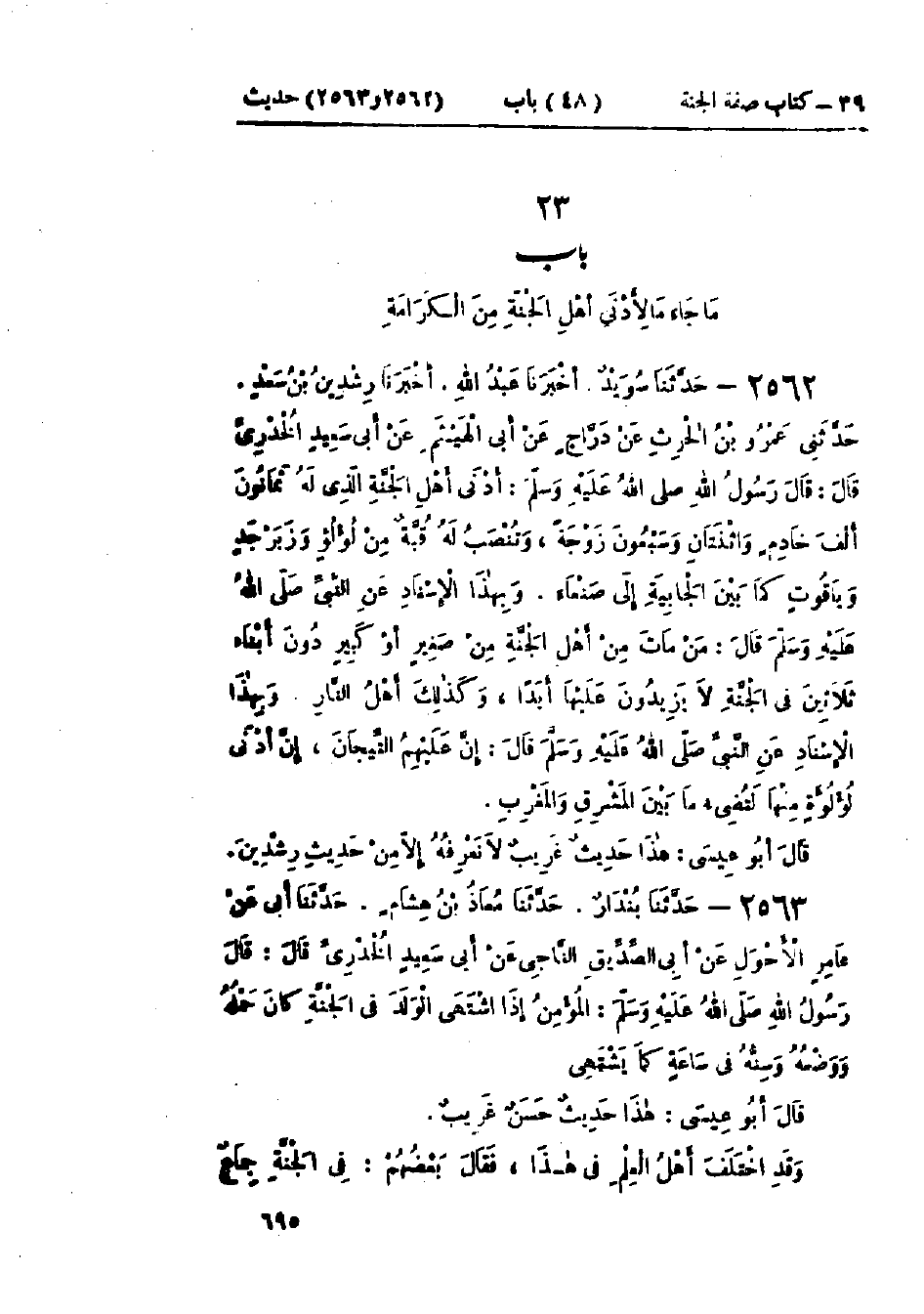 2563 - حَدَّثَنَا بُنْدَارٌ قَالَ: حَدَّثَنَا مُعَاذُ بْنُ هِشَامٍ قَالَ: حَدَّثَنَا أَبِي، عَنْ عَامِرٍ الأَحْوَلِ، عَنْ أَبِي الصِّدِّيقِ النَّاجِيِّ، عَنْ أَبِي سَعِيدٍ الخُدْرِيِّ، قَالَ: قَالَ رَسُولُ اللَّهِ صَلَّى اللَّهُ عَلَيْهِ وَسَلَّمَ: «§المُؤْمِنُ إِذَا اشْتَهَى الوَلَدَ فِي الجَنَّةِ كَانَ حَمْلُهُ وَوَضْعُهُ وَسِنُّهُ فِي سَاعَةٍ كَمَا يَشْتَهِي»: " هَذَا حَدِيثٌ حَسَنٌ غَرِيبٌ، وَقَدْ اخْتَلَفَ أَهْلُ العِلْمِ فِي هَذَا، فَقَالَ بَعْضُهُمْ: فِي الجَنَّةِ جِمَاعٌ -[696]- وَلَا يَكُونُ وَلَدٌ هَكَذَا رُوِيَ عَنْ طَاوُسٍ، وَمُجَاهِدٍ، وَإِبْرَاهِيمَ النَّخَعِيِّ " وقَالَ مُحَمَّدٌ، قَالَ إِسْحَاقُ بْنُ إِبْرَاهِيمَ، فِي حَدِيثِ النَّبِيِّ صَلَّى اللَّهُ عَلَيْهِ وَسَلَّمَ: «إِذَا اشْتَهَى المُؤْمِنُ الوَلَدَ فِي الجَنَّةِ كَانَ فِي سَاعَةٍ وَاحِدَةٍ كَمَا يَشْتَهِي وَلَكِنْ لَا يَشْتَهِي» قَالَ مُحَمَّدٌ: وَقَدْ رُوِيَ عَنْ أَبِي رَزِينٍ العُقَيْلِيِّ، عَنِ النَّبِيِّ صَلَّى اللَّهُ عَلَيْهِ وَسَلَّمَ قَالَ: «إِنَّ أَهْلَ الجَنَّةِ لَا يَكُونُ لَهُمْ فِيهَا وَلَدٌ»، " وَأَبُو الصِّدِّيقِ النَّاجِيِّ اسْمُهُ: بَكْرُ بْنُ عَمْرٍو وَيُقَالُ: بَكْرُ بْنُ قَيْسٍ أَيْضًا "