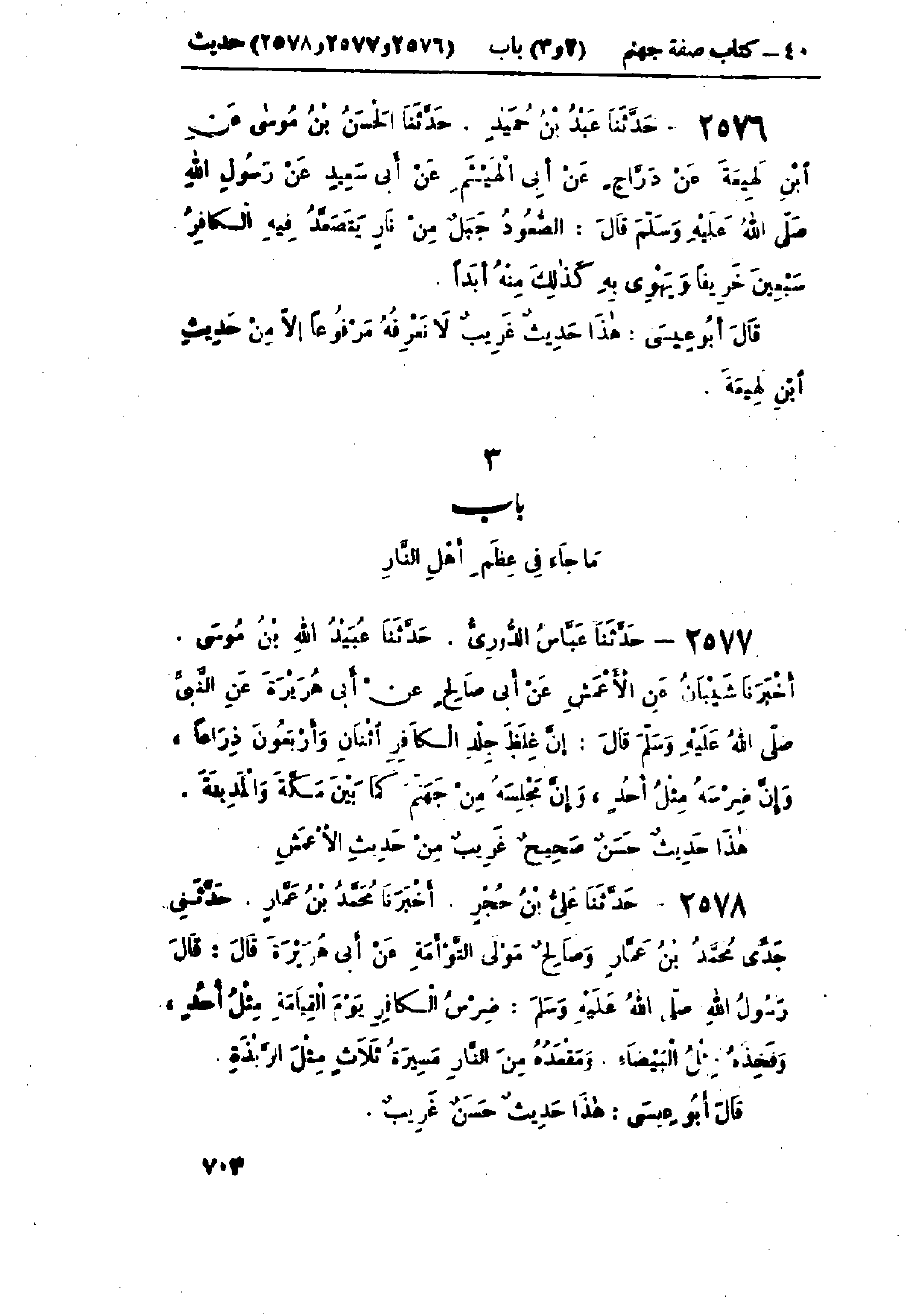 2577 - حَدَّثَنَا عَبَّاسٌ الدُّورِيُّ قَالَ: حَدَّثَنَا عُبَيْدُ اللَّهِ بْنُ مُوسَى قَالَ: أَخْبَرَنَا شَيْبَانُ، عَنْ الأَعْمَشِ، عَنْ أَبِي صَالِحٍ، عَنْ أَبِي هُرَيْرَةَ، عَنِ النَّبِيِّ صَلَّى اللَّهُ عَلَيْهِ وَسَلَّمَ، قَالَ: «إِنَّ §غِلَظَ جِلْدِ الكَافِرِ اثْنَتَانِ وَأَرْبَعُونَ ذِرَاعًا، وَإِنَّ ضِرْسَهُ مِثْلُ أُحُدٍ، وَإِنَّ مَجْلِسَهُ مِنْ جَهَنَّمَ كَمَا بَيْنَ مَكَّةَ وَالمَدِينَةِ» هَذَا حَدِيثٌ حَسَنٌ صَحِيحٌ غَرِيبٌ مِنْ حَدِيثِ الأَعْمَشِ "