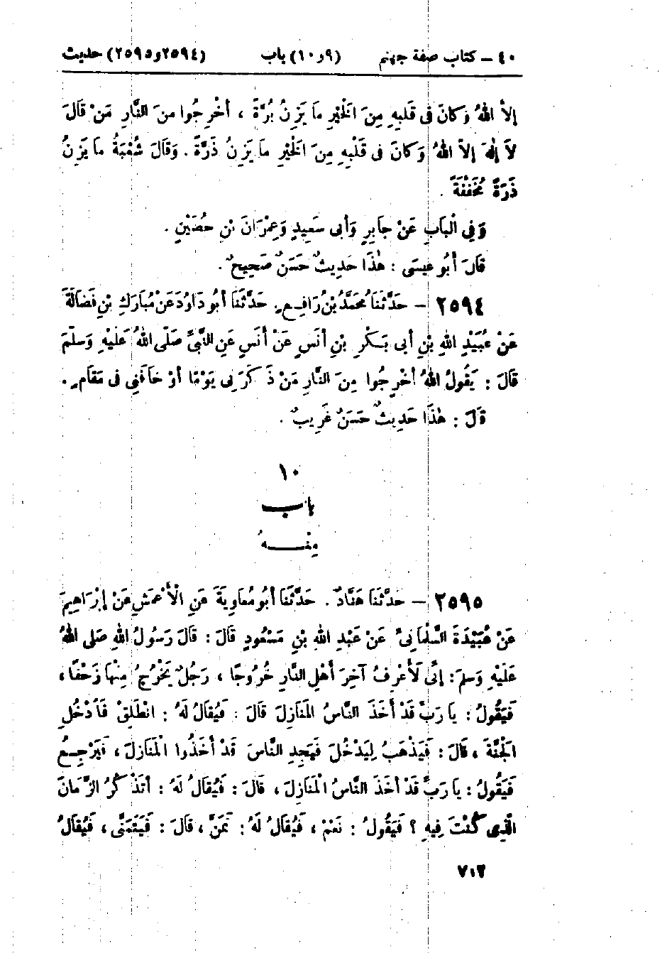 2595 - حَدَّثَنَا هَنَّادٌ قَالَ: حَدَّثَنَا أَبُو مُعَاوِيَةَ، عَنْ الأَعْمَشِ، عَنْ إِبْرَاهِيمَ، عَنْ عَبِيدَةَ السَّلْمَانِيِّ، عَنْ عَبْدِ اللَّهِ بْنِ مَسْعُودٍ، قَالَ: قَالَ رَسُولُ اللَّهِ صَلَّى اللَّهُ عَلَيْهِ وَسَلَّمَ: " §إِنِّي لَأَعْرِفُ آخِرَ أَهْلِ النَّارِ خُرُوجًا رَجُلٌ يَخْرُجُ مِنْهَا زَحْفًا فَيَقُولُ: يَا رَبِّ قَدْ أَخَذَ النَّاسُ المَنَازِلَ " قَالَ: " فَيُقَالُ لَهُ: انْطَلِقْ فَادْخُلِ الجَنَّةَ "، قَالَ: " فَيَذْهَبُ لِيَدْخُلَ فَيَجِدُ النَّاسَ قَدْ أَخَذُوا المَنَازِلَ، فَيَرْجِعُ فَيَقُولُ: يَا رَبِّ قَدْ أَخَذَ النَّاسُ المَنَازِلَ " قَالَ: " فَيُقَالُ لَهُ: أَتَذْكُرُ الزَّمَانَ الَّذِي كُنْتَ فِيهِ؟ فَيَقُولُ: نَعَمْ، فَيُقَالُ لَهُ: تَمَنَّ "، قَالَ: " فَيَتَمَنَّى، فَيُقَالُ -[713]- لَهُ: فَإِنَّ لَكَ مَا تَمَنَّيْتَ وَعَشْرَةَ أَضْعَافِ الدُّنْيَا " قَالَ: " فَيَقُولُ: أَتَسْخَرُ بِي وَأَنْتَ المَلِكُ "، قَالَ: فَلَقَدْ رَأَيْتُ رَسُولَ اللَّهِ صَلَّى اللَّهُ عَلَيْهِ وَسَلَّمَ ضَحِكَ حَتَّى بَدَتْ نَوَاجِذُهُ: «هَذَا حَدِيثٌ حَسَنٌ صَحِيحٌ»