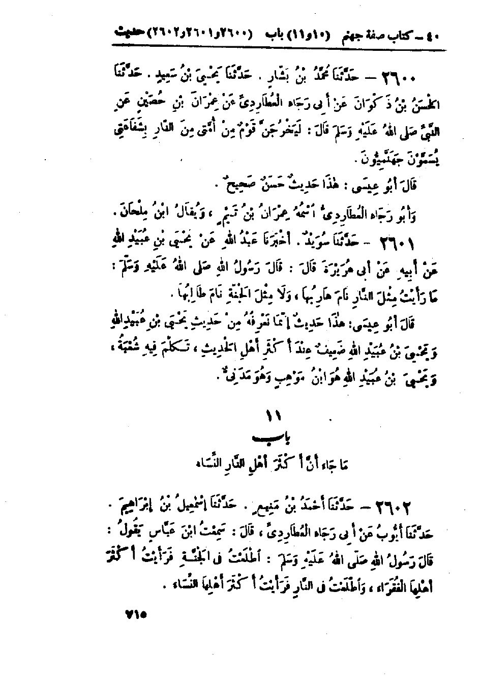 2602 - حَدَّثَنَا أَحْمَدُ بْنُ مَنِيعٍ قَالَ: حَدَّثَنَا إِسْمَاعِيلُ بْنُ إِبْرَاهِيمَ قَالَ: حَدَّثَنَا أَيُّوبُ، عَنْ أَبِي رَجَاءٍ العُطَارِدِيِّ، قَالَ: سَمِعْتُ ابْنَ عَبَّاسٍ، يَقُولُ: قَالَ رَسُولُ اللَّهِ صَلَّى اللَّهُ عَلَيْهِ وَسَلَّمَ: «§اطَّلَعْتُ فِي الجَنَّةِ فَرَأَيْتُ أَكْثَرَ أَهْلِهَا الفُقَرَاءَ، وَاطَّلَعْتُ فِي النَّارِ فَرَأَيْتُ أَكْثَرَ أَهْلِهَا النِّسَاءَ» هَذَا حَدِيثٌ حَسَنٌ صَحِيحٌ