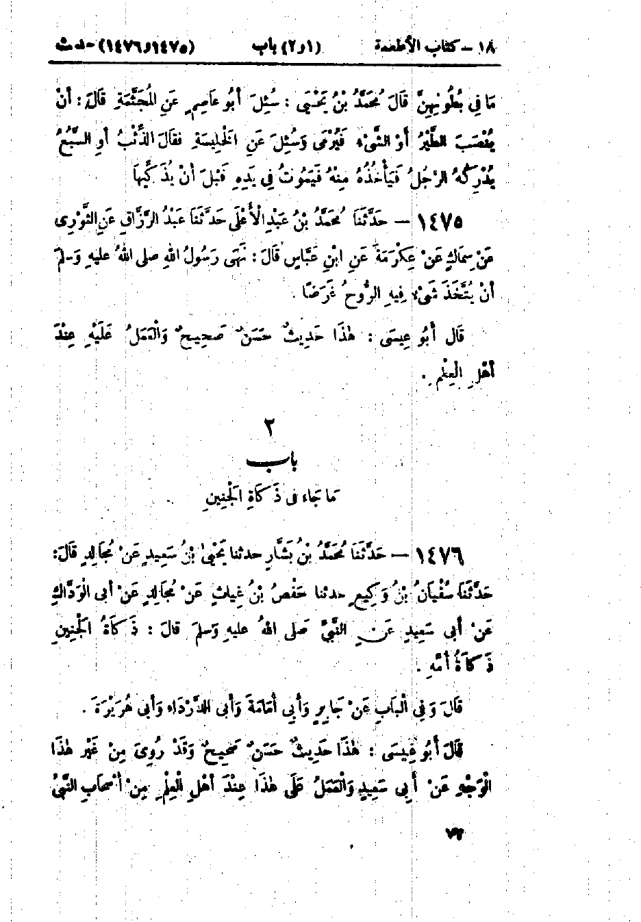 1476 - حَدَّثَنَا مُحَمَّدُ بْنُ بَشَّارٍ قَالَ: حَدَّثَنَا يَحْيَى بْنُ سَعِيدٍ، عَنْ مُجَالِدٍ، ح وَحَدَّثَنَا سُفْيَانُ بْنُ وَكِيعٍ قَالَ: حَدَّثَنَا حَفْصُ بْنُ غِيَاثٍ، عَنْ مُجَالِدٍ، عَنْ أَبِي الوَدَّاكِ، عَنْ أَبِي سَعِيدٍ، عَنِ النَّبِيِّ صَلَّى اللَّهُ عَلَيْهِ وَسَلَّمَ قَالَ: «§ذَكَاةُ الجَنِينِ ذَكَاةُ أُمِّهِ» وَفِي البَابِ عَنْ جَابِرٍ، وَأَبِي أُمَامَةَ، وَأَبِي الدَّرْدَاءِ، وَأَبِي هُرَيْرَةَ: هَذَا حَدِيثٌ حَسَنٌ، وَقَدْ رُوِيَ مِنْ غَيْرِ هَذَا الوَجْهِ عَنْ أَبِي سَعِيدٍ وَالعَمَلُ عَلَى هَذَا عِنْدَ أَهْلِ العِلْمِ مِنْ أَصْحَابِ النَّبِيِّ -[73]- صَلَّى اللَّهُ عَلَيْهِ وَسَلَّمَ، وَغَيْرِهِمْ، وَهُوَ قَوْلُ سُفْيَانَ الثَّوْرِيِّ، وَابْنِ المُبَارَكِ، وَالشَّافِعِيِّ، وَأَحْمَدَ، وَإِسْحَاقَ وَأَبُو الوَدَّاكِ اسْمُهُ جَبْرُ بْنُ نَوْفٍ