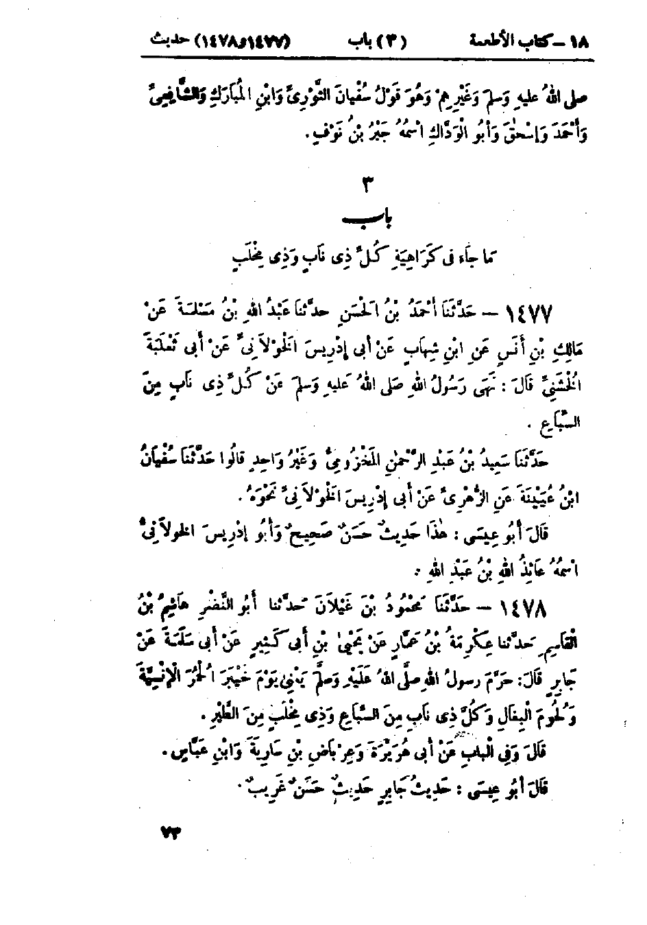 1477 - حَدَّثَنَا أَحْمَدُ بْنُ الحَسَنِ قَالَ: حَدَّثَنَا عَبْدُ اللَّهِ بْنُ مَسْلَمَةَ، عَنْ مَالِكِ بْنِ أَنَسٍ، عَنْ ابْنِ شِهَابٍ، عَنْ أَبِي إِدْرِيسَ الخَوْلَانِيِّ، عَنْ أَبِي ثَعْلَبَةَ الخُشَنِيِّ قَالَ: «§نَهَى رَسُولُ اللَّهِ صَلَّى اللَّهُ عَلَيْهِ وَسَلَّمَ عَنْ كُلِّ ذِي نَابٍ مِنَ السِّبَاعِ» حَدَّثَنَا سَعِيدُ بْنُ عَبْدِ الرَّحْمَنِ المَخْزُومِيُّ، وَغَيْرُ وَاحِدٍ، قَالُوا: حَدَّثَنَا سُفْيَانُ بْنُ عُيَيْنَةَ، عَنِ الزُّهْرِيِّ، عَنْ أَبِي إِدْرِيسَ الخَوْلَانِيِّ نَحْوَهُ،: هَذَا حَدِيثٌ حَسَنٌ صَحِيحٌ، وَأَبُو إِدْرِيسَ الخَوْلَانِيُّ اسْمُهُ عَائِذُ اللَّهِ بْنُ عَبْدِ اللَّهِ