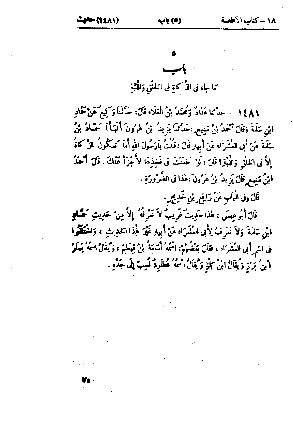 1481 - حَدَّثَنَا هَنَّادٌ، وَمُحَمَّدُ بْنُ العَلَاءِ، قَالَا: حَدَّثَنَا وَكِيعٌ، عَنْ حَمَّادِ بْنِ سَلَمَةَ، ح وَقَالَ أَحْمَدُ بْنُ مَنِيعٍ، حَدَّثَنَا يَزِيدُ بْنُ هَارُونَ قَالَ: حَدَّثَنَا حَمَّادُ بْنُ سَلَمَةَ، عَنْ أَبِي الْعُشَرَاءِ، عَنْ أَبِيهِ، قَالَ: قُلْتُ: يَا رَسُولَ اللَّهِ، أَمَا تَكُونُ الذَّكَاةُ إِلَّا فِي الحَلْقِ وَاللَّبَّةِ؟ قَالَ: «§لَوْ طَعَنْتَ فِي فَخِذِهَا لَأَجْزَأَ عَنْكَ» قَالَ أَحْمَدُ بْنُ مَنِيعٍ: قَالَ يَزِيدُ بْنُ هَارُونَ: هَذَا فِي الضَّرُورَةِ وَفِي البَابِ عَنْ رَافِعِ بْنِ خَدِيجٍ: هَذَا حَدِيثٌ غَرِيبٌ لَا نَعْرِفُهُ إِلَّا مِنْ حَدِيثِ حَمَّادِ بْنِ سَلَمَةَ، وَلَا نَعْرِفُ لِأَبِي العُشَرَاءِ عَنْ أَبِيهِ غَيْرَ هَذَا الحَدِيثِ وَاخْتَلَفُوا فِي اسْمِ أَبِي العُشَرَاءِ، فَقَالَ بَعْضُهُمْ: اسْمُهُ أُسَامَةُ بْنُ قِهْطِمٍ، وَيُقَالُ: اسْمُهُ يَسَارُ بْنُ بَرْزٍ، وَيُقَالُ: ابْنُ بَلْزٍ، وَيُقَالُ: اسْمُهُ عُطَارِدٌ نُسِبَ إِلَى جَدِّهِ