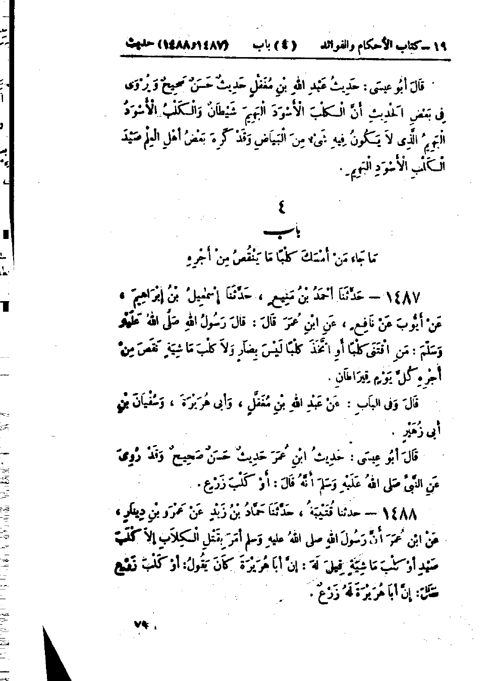1488 - حَدَّثَنَا قُتَيْبَةُ قَالَ: حَدَّثَنَا حَمَّادُ بْنُ زَيْدٍ، عَنْ عَمْرِو بْنِ دِينَارٍ، عَنْ ابْنِ عُمَرَ، «أَنَّ رَسُولَ اللَّهِ صَلَّى اللَّهُ عَلَيْهِ وَسَلَّمَ §أَمَرَ بِقَتْلِ الكِلَابِ، إِلَّا كَلْبَ صَيْدٍ، أَوْ كَلْبَ مَاشِيَةٍ»، قَالَ: قِيلَ لَهُ إِنَّ أَبَا هُرَيْرَةَ كَانَ يَقُولُ: «أَوْ كَلْبَ زَرْعٍ»، فَقَالَ: إِنَّ أَبَا هُرَيْرَةَ لَهُ زَرْعٌ: -[80]- هَذَا حَدِيثٌ حَسَنٌ صَحِيحٌ