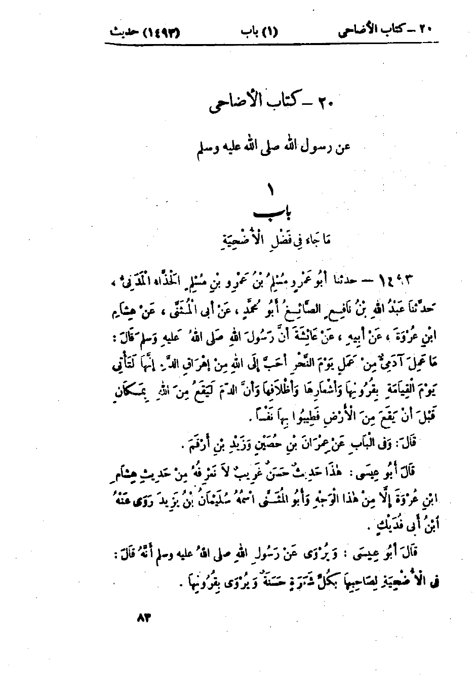 1493 - حَدَّثَنَا أَبُو عَمْرٍو مُسْلِمُ بْنُ عَمْرِو بْنِ مُسْلِمٍ الحَذَّاءُ المَدَنِيُّ قَالَ: حَدَّثَنَا عَبْدُ اللَّهِ بْنُ نَافِعٍ الصَّائِغُ أَبُو مُحَمَّدٍ، عَنْ أَبِي المُثَنَّى، عَنْ هِشَامِ بْنِ عُرْوَةَ، عَنْ أَبِيهِ، عَنْ عَائِشَةَ، أَنَّ رَسُولَ اللَّهِ صَلَّى اللَّهُ عَلَيْهِ وَسَلَّمَ قَالَ: «§مَا عَمِلَ آدَمِيٌّ مِنْ عَمَلٍ يَوْمَ النَّحْرِ أَحَبَّ إِلَى اللَّهِ مِنْ إِهْرَاقِ الدَّمِ، إِنَّهُ لَيَأْتِي يَوْمَ القِيَامَةِ بِقُرُونِهَا وَأَشْعَارِهَا وَأَظْلَافِهَا، وَأَنَّ الدَّمَ لَيَقَعُ مِنَ اللَّهِ بِمَكَانٍ قَبْلَ أَنْ يَقَعَ مِنَ الأَرْضِ، فَطِيبُوا بِهَا نَفْسًا» وَفِي البَابِ عَنْ عِمْرَانَ بْنِ حُصَيْنٍ، وَزَيْدِ بْنِ أَرْقَمَ: هَذَا حَدِيثٌ حَسَنٌ غَرِيبٌ، لَا نَعْرِفُهُ مِنْ حَدِيثِ هِشَامِ بْنِ عُرْوَةَ إِلَّا مِنْ هَذَا الوَجْهِ وَأَبُو المُثَنَّى اسْمُهُ سُلَيْمَانُ بْنُ يَزِيدَ رَوَى عَنْهُ ابْنُ أَبِي فُدَيْكٍ: وَيُرْوَى عَنْ رَسُولِ اللَّهِ صَلَّى اللَّهُ عَلَيْهِ وَسَلَّمَ أَنَّهُ قَالَ: «فِي الأُضْحِيَّةِ لِصَاحِبِهَا بِكُلِّ شَعَرَةٍ حَسَنَةٌ وَيُرْوَى بِقُرُونِهَا»