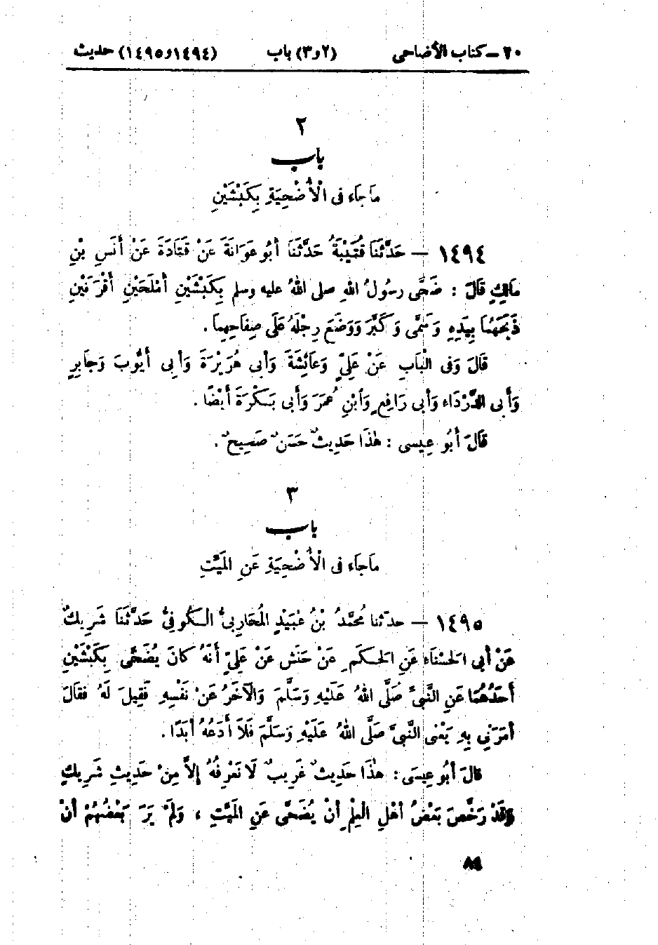 1494 - حَدَّثَنَا قُتَيْبَةُ قَالَ: حَدَّثَنَا أَبُو عَوَانَةَ، عَنْ قَتَادَةَ، عَنْ أَنَسِ بْنِ مَالِكٍ قَالَ: «§ضَحَّى رَسُولُ اللَّهِ صَلَّى اللَّهُ عَلَيْهِ وَسَلَّمَ بِكَبْشَيْنِ أَمْلَحَيْنِ أَقْرَنَيْنِ، ذَبَحَهُمَا بِيَدِهِ، وَسَمَّى وَكَبَّرَ وَوَضَعَ رِجْلَهُ عَلَى صِفَاحِهِمَا» وَفِي البَابِ عَنْ عَلِيٍّ، وَعَائِشَةَ، وَأَبِي هُرَيْرَةَ، وَأَبِي أَيُّوبَ، وَجَابِرٍ، وَأَبِي الدَّرْدَاءِ، وَأَبِي رَافِعٍ، وَابْنِ عُمَرَ، وَأَبِي بَكْرَةَ: هَذَا حَدِيثٌ حَسَنٌ صَحِيحٌ