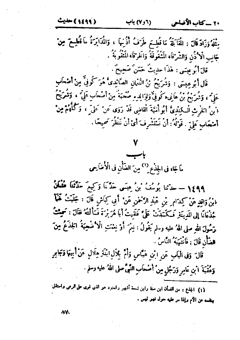 1499 - حَدَّثَنَا يُوسُفُ بْنُ عِيسَى قَالَ: حَدَّثَنَا وَكِيعٌ قَالَ: حَدَّثَنَا عُثْمَانُ بْنُ وَاقِدٍ، عَنْ كِدَامِ بْنِ عَبْدِ الرَّحْمَنِ، عَنْ أَبِي كِبَاشٍ قَالَ: جَلَبْتُ غَنَمًا جُذْعَانًا إِلَى المَدِينَةِ فَكَسَدَتْ عَلَيَّ، فَلَقِيتُ أَبَا هُرَيْرَةَ فَسَأَلْتُهُ، فَقَالَ: سَمِعْتُ رَسُولَ اللَّهِ صَلَّى اللَّهُ عَلَيْهِ وَسَلَّمَ يَقُولُ: «§نِعْمَ الْأُضْحِيَّةُ الجَذَعُ مِنَ الضَّأْنِ»، قَالَ: فَانْتَهَبَهُ النَّاسُ وَفِي البَابِ عَنْ ابْنِ عَبَّاسٍ، وَأُمِّ بِلَالِ ابْنَةِ هِلَالٍ، عَنْ أَبِيهَا، وَجَابِرٍ، وَعُقْبَةَ بْنِ عَامِرٍ، وَرَجُلٍ مِنْ أَصْحَابِ النَّبِيِّ صَلَّى اللَّهُ عَلَيْهِ وَسَلَّمَ: -[88]- حَدِيثُ أَبِي هُرَيْرَةَ حَدِيثٌ غَرِيبٌ. وَقَدْ رُوِيَ هَذَا عَنْ أَبِي هُرَيْرَةَ مَوْقُوفًا وَعُثْمَانُ بْنُ وَاقِدٍ هُوَ: ابْنُ مُحَمَّدِ بْنِ زِيَادِ بْنِ عَبْدِ اللَّهِ بْنِ عُمَرَ بْنِ الخَطَّابِ وَالعَمَلُ عَلَى هَذَا عِنْدَ أَهْلِ العِلْمِ مِنْ أَصْحَابِ النَّبِيِّ صَلَّى اللَّهُ عَلَيْهِ وَسَلَّمَ وَغَيْرِهِمْ، أَنَّ الجَذَعَ مِنَ الضَّأْنِ يُجْزِئُ فِي الأُضْحِيَّةِ