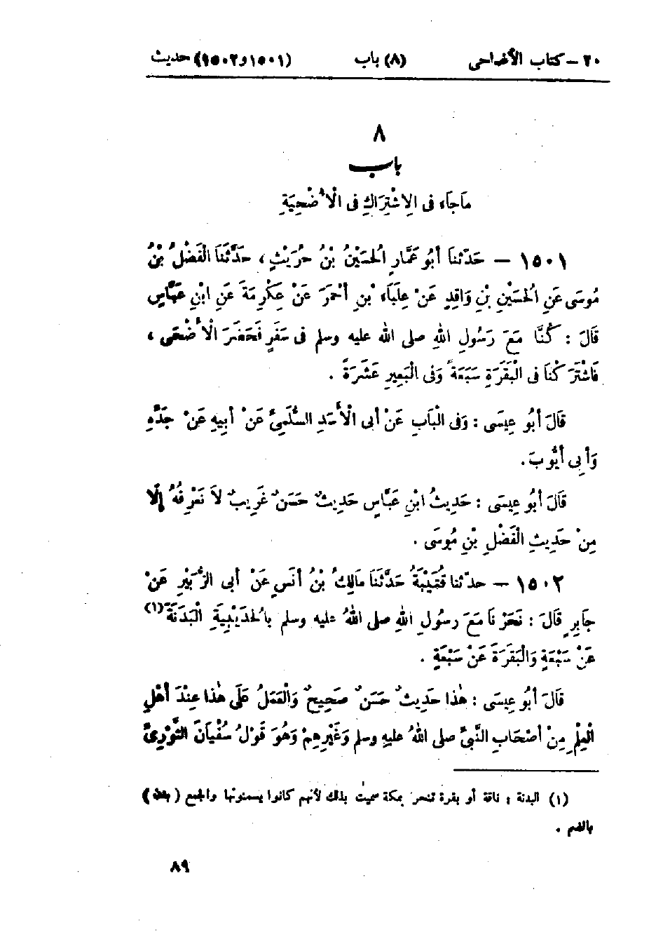 1501 - حَدَّثَنَا أَبُو عَمَّارٍ الحُسَيْنُ بْنُ حُرَيْثٍ قَالَ: حَدَّثَنَا الفَضْلُ بْنُ مُوسَى، عَنْ الحُسَيْنِ بْنِ وَاقِدٍ، عَنْ عِلْبَاءَ بْنِ أَحْمَرَ، عَنْ عِكْرِمَةَ، عَنْ ابْنِ عَبَّاسٍ قَالَ: «كُنَّا مَعَ رَسُولِ اللَّهِ صَلَّى اللَّهُ عَلَيْهِ وَسَلَّمَ فِي سَفَرٍ §فَحَضَرَ الأَضْحَى فَاشْتَرَكْنَا فِي البَقَرَةِ سَبْعَةً، وَفِي البَعِيرِ عَشَرَةً»: وَفِي البَابِ عَنْ أَبِي الأَسَدِ السُّلَمِيِّ، عَنْ أَبِيهِ، عَنْ جَدِّهِ، وَأَبِي أَيُّوبَ: حَدِيثُ ابْنِ عَبَّاسٍ حَدِيثٌ حَسَنٌ غَرِيبٌ لَا نَعْرِفُهُ إِلَّا مِنْ حَدِيثِ الفَضْلِ بْنِ مُوسَى