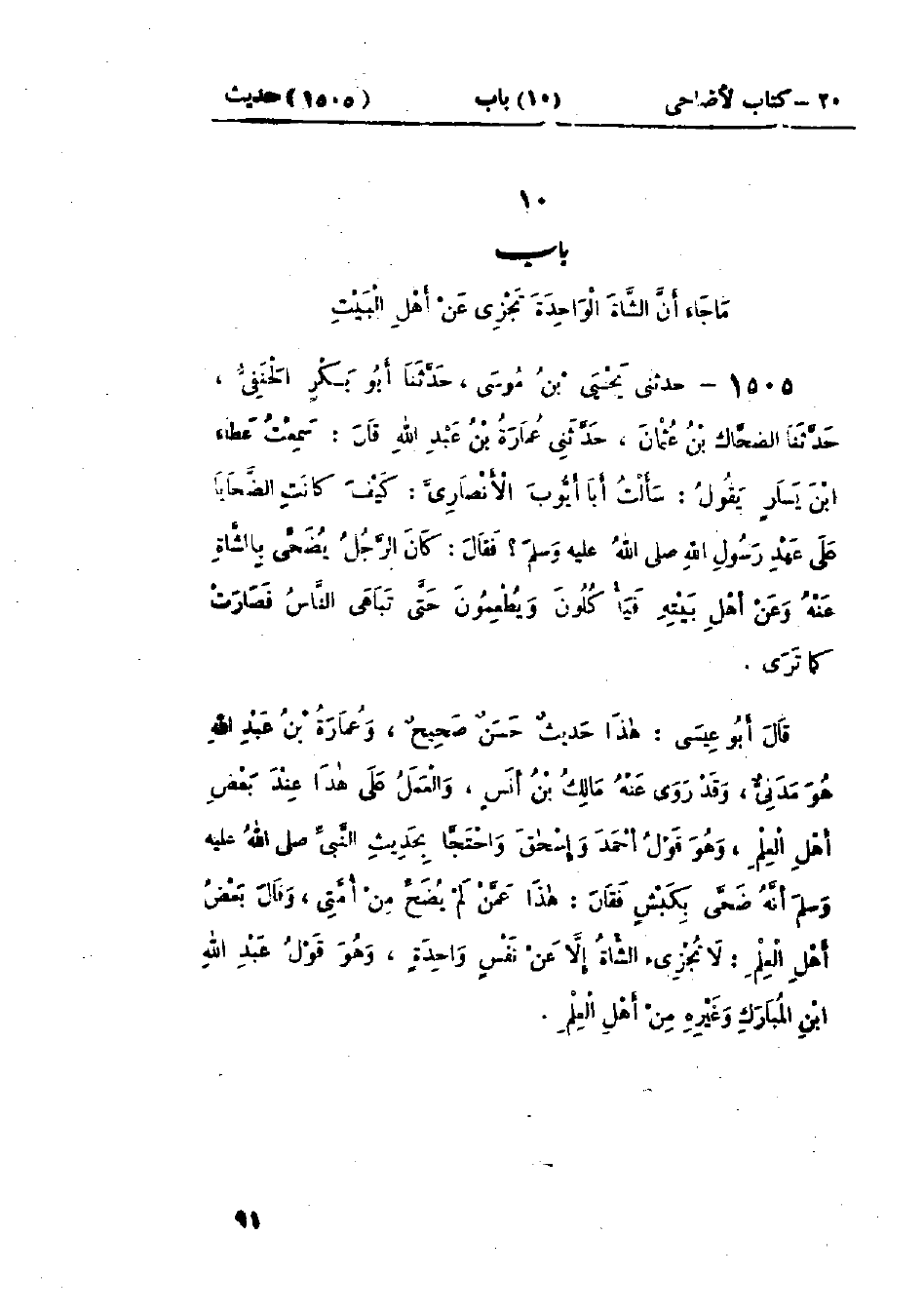1505 - حَدَّثَنَا يَحْيَى بْنُ مُوسَى قَالَ: حَدَّثَنَا أَبُو بَكْرٍ الحَنَفِيُّ قَالَ: حَدَّثَنَا الضَّحَّاكُ بْنُ عُثْمَانَ قَالَ: حَدَّثَنِي عُمَارَةُ بْنُ عَبْدِ اللَّهِ قَالَ: سَمِعْتُ عَطَاءَ بْنَ يَسَارٍ يَقُولُ: سَأَلْتُ أَبَا أَيُّوبَ الأَنْصَارِيَّ: كَيْفَ كَانَتِ الضَّحَايَا عَلَى عَهْدِ رَسُولِ اللَّهِ صَلَّى اللَّهُ عَلَيْهِ وَسَلَّمَ؟ فَقَالَ: «كَانَ §الرَّجُلُ يُضَحِّي بِالشَّاةِ عَنْهُ وَعَنْ أَهْلِ بَيْتِهِ، فَيَأْكُلُونَ وَيُطْعِمُونَ حَتَّى تَبَاهَى النَّاسُ، فَصَارَتْ كَمَا تَرَى»: هَذَا حَدِيثٌ حَسَنٌ صَحِيحٌ وَعُمَارَةُ بْنُ عَبْدِ اللَّهِ مَدِينِيٌّ، وَقَدْ رَوَى عَنْهُ مَالِكُ بْنُ أَنَسٍ وَالعَمَلُ عَلَى هَذَا عِنْدَ بَعْضِ أَهْلِ العِلْمِ، وَهُوَ قَوْلُ أَحْمَدَ، وَإِسْحَاقَ، وَاحْتَجَّا بِحَدِيثِ النَّبِيِّ صَلَّى اللَّهُ عَلَيْهِ وَسَلَّمَ أَنَّهُ ضَحَّى بِكَبْشٍ، فَقَالَ: «هَذَا عَمَّنْ لَمْ يُضَحِّ مِنْ أُمَّتِي»، وَقَالَ بَعْضُ أَهْلِ العِلْمِ: لَا تُجْزِي الشَّاةُ إِلَّا عَنْ نَفْسٍ وَاحِدَةٍ، وَهُوَ قَوْلُ عَبْدِ اللَّهِ بْنِ المُبَارَكِ، وَغَيْرِهِ مِنْ أَهْلِ العِلْمِ