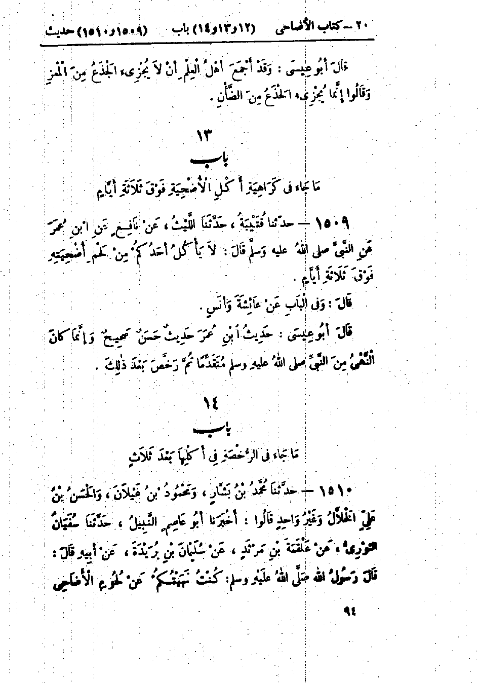 1509 - حَدَّثَنَا قُتَيْبَةُ قَالَ: حَدَّثَنَا اللَّيْثُ، عَنْ نَافِعٍ، عَنْ ابْنِ عُمَرَ، أَنَّ النَّبِيَّ صَلَّى اللَّهُ عَلَيْهِ وَسَلَّمَ قَالَ: «§لَا يَأْكُلُ أَحَدُكُمْ مِنْ لَحْمِ أُضْحِيَّتِهِ فَوْقَ ثَلَاثَةِ أَيَّامٍ» وَفِي البَابِ عَنْ عَائِشَةَ، وَأَنَسٍ: حَدِيثُ ابْنِ عُمَرَ حَدِيثٌ حَسَنٌ صَحِيحٌ، وَإِنَّمَا كَانَ النَّهْيُ مِنَ النَّبِيِّ صَلَّى اللَّهُ عَلَيْهِ وَسَلَّمَ مُتَقَدِّمًا ثُمَّ رَخَّصَ بَعْدَ ذَلِكَ