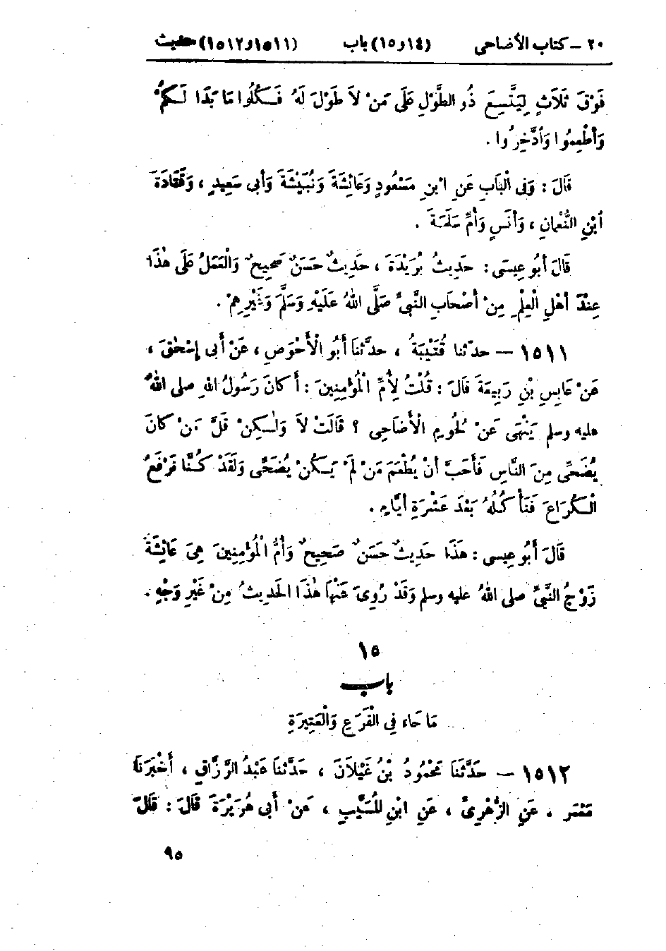 1511 - حَدَّثَنَا قُتَيْبَةُ قَالَ: حَدَّثَنَا أَبُو الأَحْوَصِ، عَنْ أَبِي إِسْحَاقَ، عَنْ عَابِسِ بْنِ رَبِيعَةَ، قَالَ: قُلْتُ لِأُمِّ المُؤْمِنِينَ: أَكَانَ رَسُولُ اللَّهِ صَلَّى اللَّهُ عَلَيْهِ وَسَلَّمَ يَنْهَى عَنْ لُحُومِ الأَضَاحِيِّ؟ قَالَتْ: «لَا، وَلَكِنْ §قَلَّ مَنْ كَانَ يُضَحِّي مِنَ النَّاسِ فَأَحَبَّ أَنْ يَطْعَمَ مَنْ لَمْ يَكُنْ يُضَحِّي، وَلَقَدْ كُنَّا نَرْفَعُ الكُرَاعَ فَنَأْكُلُهُ بَعْدَ عَشَرَةِ أَيَّامٍ»: هَذَا حَدِيثٌ حَسَنٌ صَحِيحٌ، وَأُمُّ المُؤْمِنِينَ هِيَ عَائِشَةُ زَوْجُ النَّبِيِّ صَلَّى اللَّهُ عَلَيْهِ وَسَلَّمَ، وَقَدْ رُوِيَ عَنْهَا هَذَا الحَدِيثُ مِنْ غَيْرِ وَجْهٍ