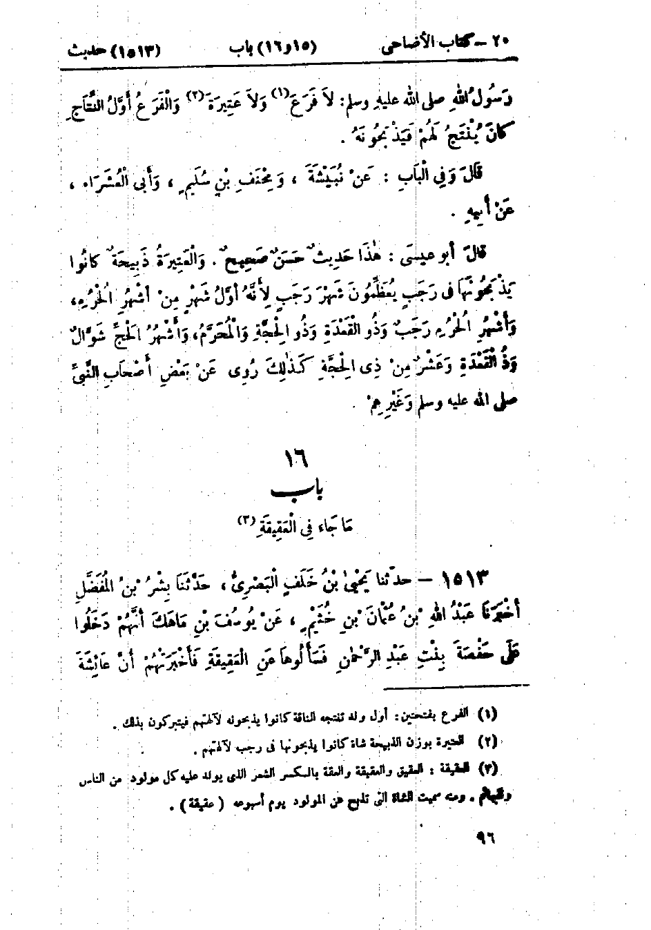 1513 - حَدَّثَنَا يَحْيَى بْنُ خَلَفٍ البَصْرِيُّ قَالَ: حَدَّثَنَا بِشْرُ بْنُ المُفَضَّلِ قَالَ: أَخْبَرَنَا عَبْدُ اللَّهِ بْنُ عُثْمَانَ بْنِ خُثَيْمٍ، عَنْ يُوسُفَ بْنِ مَاهَكَ، أَنَّهُمْ دَخَلُوا عَلَى حَفْصَةَ بِنْتِ عَبْدِ الرَّحْمَنِ فَسَأَلُوهَا عَنِ العَقِيقَةِ، فَأَخْبَرَتْهُمْ أَنَّ عَائِشَةَ -[97]- أَخْبَرَتْهَا، «أَنَّ رَسُولَ اللَّهِ صَلَّى اللَّهُ عَلَيْهِ وَسَلَّمَ §أَمَرَهُمْ عَنِ الغُلَامِ شَاتَانِ مُكَافِئَتَانِ، وَعَنِ الجَارِيَةِ شَاةٌ» وَفِي البَابِ عَنْ عَلِيٍّ، وَأُمِّ كُرْزٍ، وَبُرَيْدَةَ، وَسَمُرَةَ، وَأَبِي هُرَيْرَةَ، وَعَبْدِ اللَّهِ بْنِ عَمْرٍو، وَأَنَسٍ، وَسَلْمَانَ بْنِ عَامِرٍ، وَابْنِ عَبَّاسٍ: حَدِيثُ عَائِشَةَ حَدِيثٌ حَسَنٌ صَحِيحٌ وَحَفْصَةُ هِيَ بِنْتُ عَبْدِ الرَّحْمَنِ بْنِ أَبِي بَكْرٍ الصِّدِّيقِ