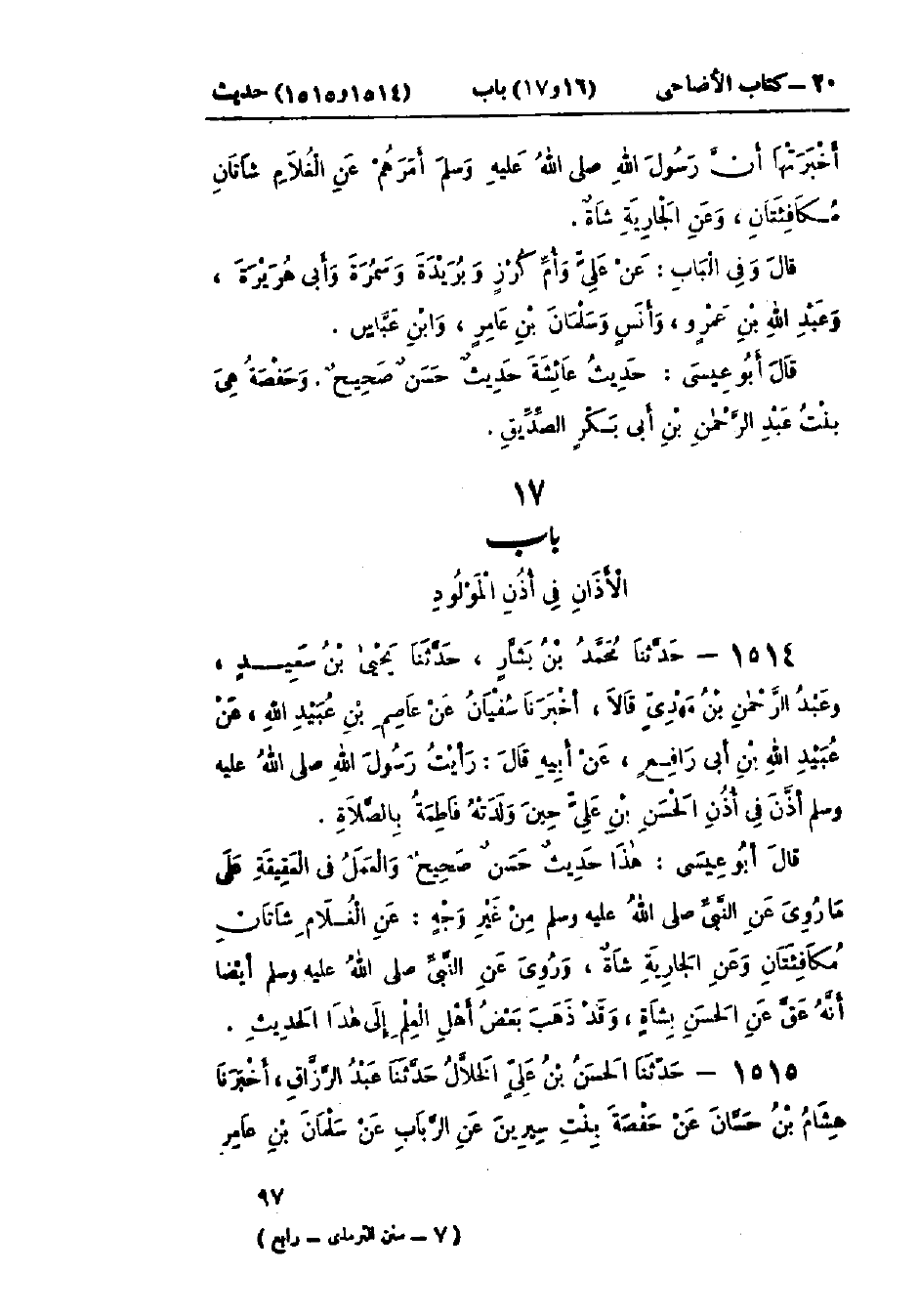 1514 - حَدَّثَنَا مُحَمَّدُ بْنُ بَشَّارٍ قَالَ: حَدَّثَنَا يَحْيَى بْنُ سَعِيدٍ، وَعَبْدُ الرَّحْمَنِ بْنُ مَهْدِيٍّ، قَالَا: أَخْبَرَنَا سُفْيَانُ، عَنْ عَاصِمِ بْنِ عُبَيْدِ اللَّهِ، عَنْ عُبَيْدِ اللَّهِ بْنِ أَبِي رَافِعٍ، عَنْ أَبِيهِ قَالَ: «رَأَيْتُ رَسُولَ اللَّهِ صَلَّى اللَّهُ عَلَيْهِ وَسَلَّمَ §أَذَّنَ فِي أُذُنِ الحَسَنِ بْنِ عَلِيٍّ حِينَ وَلَدَتْهُ فَاطِمَةُ بِالصَّلَاةِ»: هَذَا حَدِيثٌ حَسَنٌ صَحِيحٌ وَالعَمَلُ فِي العَقِيقَةِ عَلَى مَا رُوِيَ عَنِ النَّبِيِّ صَلَّى اللَّهُ عَلَيْهِ وَسَلَّمَ مِنْ غَيْرِ وَجْهٍ «عَنِ الغُلَامِ شَاتَانِ مُكَافِئَتَانِ، وَعَنِ الجَارِيَةِ شَاةٌ» وَرُوِيَ عَنِ النَّبِيِّ صَلَّى اللَّهُ عَلَيْهِ وَسَلَّمَ أَيْضًا أَنَّهُ «عَقَّ عَنِ الْحَسَنِ بِشَاةٍ» وَقَدْ ذَهَبَ بَعْضُ أَهْلِ العِلْمِ إِلَى هَذَا الحَدِيثِ