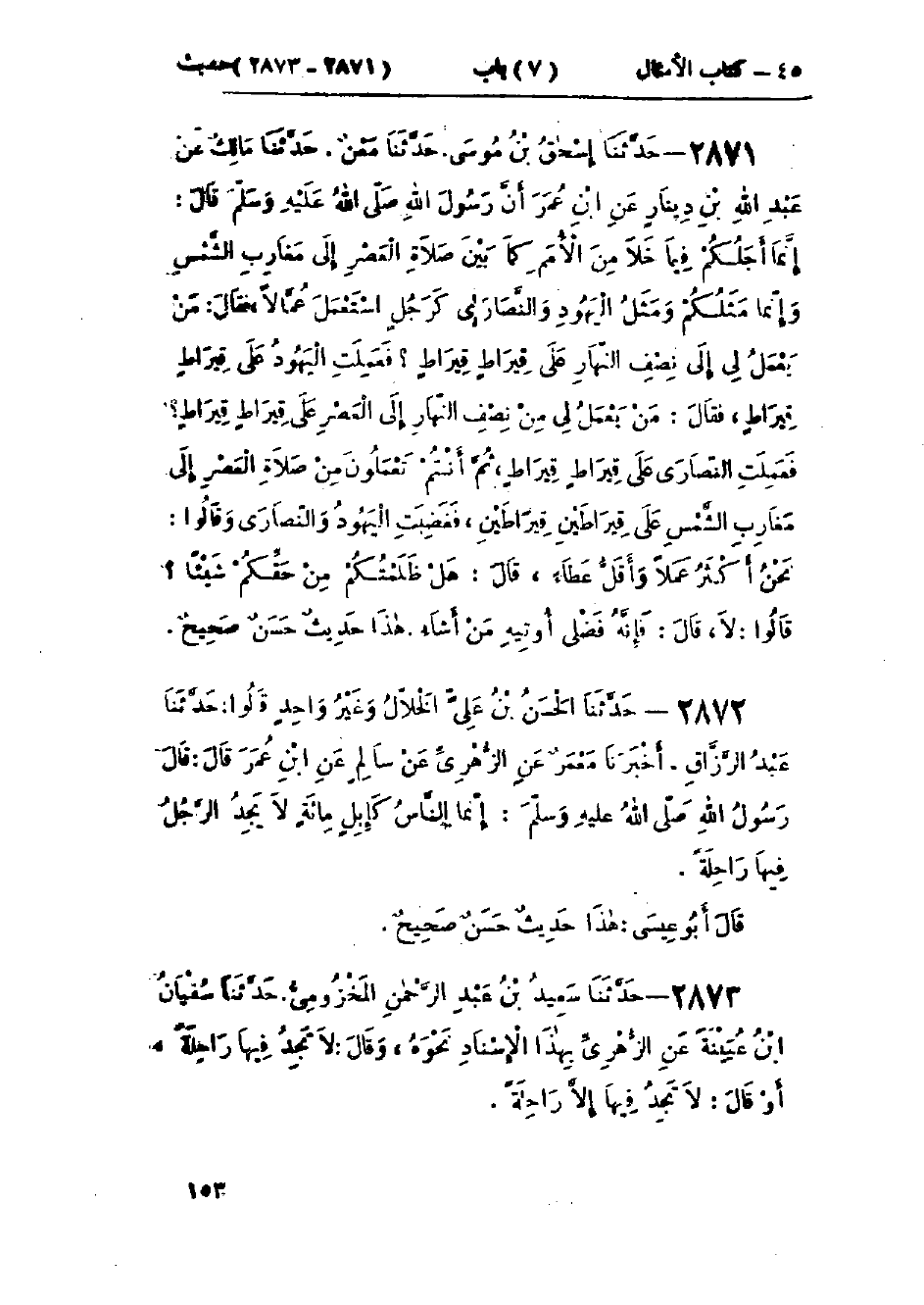 2871 - حَدَّثَنَا إِسْحَاقُ بْنُ مُوسَى قَالَ: حَدَّثَنَا مَعْنٌ قَالَ: حَدَّثَنَا مَالِكٌ، عَنْ عَبْدِ اللَّهِ بْنِ دِينَارٍ، عَنْ ابْنِ عُمَرَ، أَنَّ رَسُولَ اللَّهِ صَلَّى اللَّهُ عَلَيْهِ وَسَلَّمَ قَالَ: " §إِنَّمَا أَجَلُكُمْ فِيمَا خَلَا مِنَ الأُمَمِ كَمَا بَيْنَ صَلَاةِ العَصْرِ إِلَى مَغَارِبِ الشَّمْسِ وَإِنَّمَا مَثَلُكُمْ وَمَثَلُ اليَهُودِ وَالنَّصَارَى كَرَجُلٍ اسْتَعْمَلَ عُمَّالًا، فَقَالَ: مَنْ يَعْمَلُ لِي إِلَى نِصْفِ النَّهَارِ عَلَى قِيرَاطٍ قِيرَاطٍ؟ فَعَمِلَتِ اليَهُودُ عَلَى قِيرَاطٍ قِيرَاطٍ، فَقَالَ: مَنْ يَعْمَلُ لِي مِنْ نِصْفِ النَّهَارِ إِلَى الْعَصْرِ عَلَى قِيرَاطٍ قِيرَاطٍ فَعَمِلَتِ النَّصَارَى عَلَى قِيرَاطٍ قِيرَاطٍ، ثُمَّ أَنْتُمْ تَعْمَلُونَ مِنْ صَلَاةِ العَصْرِ إِلَى مَغَارِبِ الشَّمْسِ عَلَى قِيرَاطَيْنِ قِيرَاطَيْنِ، فَغَضِبَتِ اليَهُودُ وَالنَّصَارَى وَقَالُوا: نَحْنُ أَكْثَرُ عَمَلًا وَأَقَلُّ عَطَاءً، قَالَ: هَلْ ظَلَمْتُكُمْ مِنْ حَقِّكُمْ شَيْئًا؟ قَالُوا: لَا، قَالَ: فَإِنَّهُ فَضْلِي أُوتِيهِ مَنْ أَشَاءُ ": «هَذَا حَدِيثٌ حَسَنٌ صَحِيحٌ»