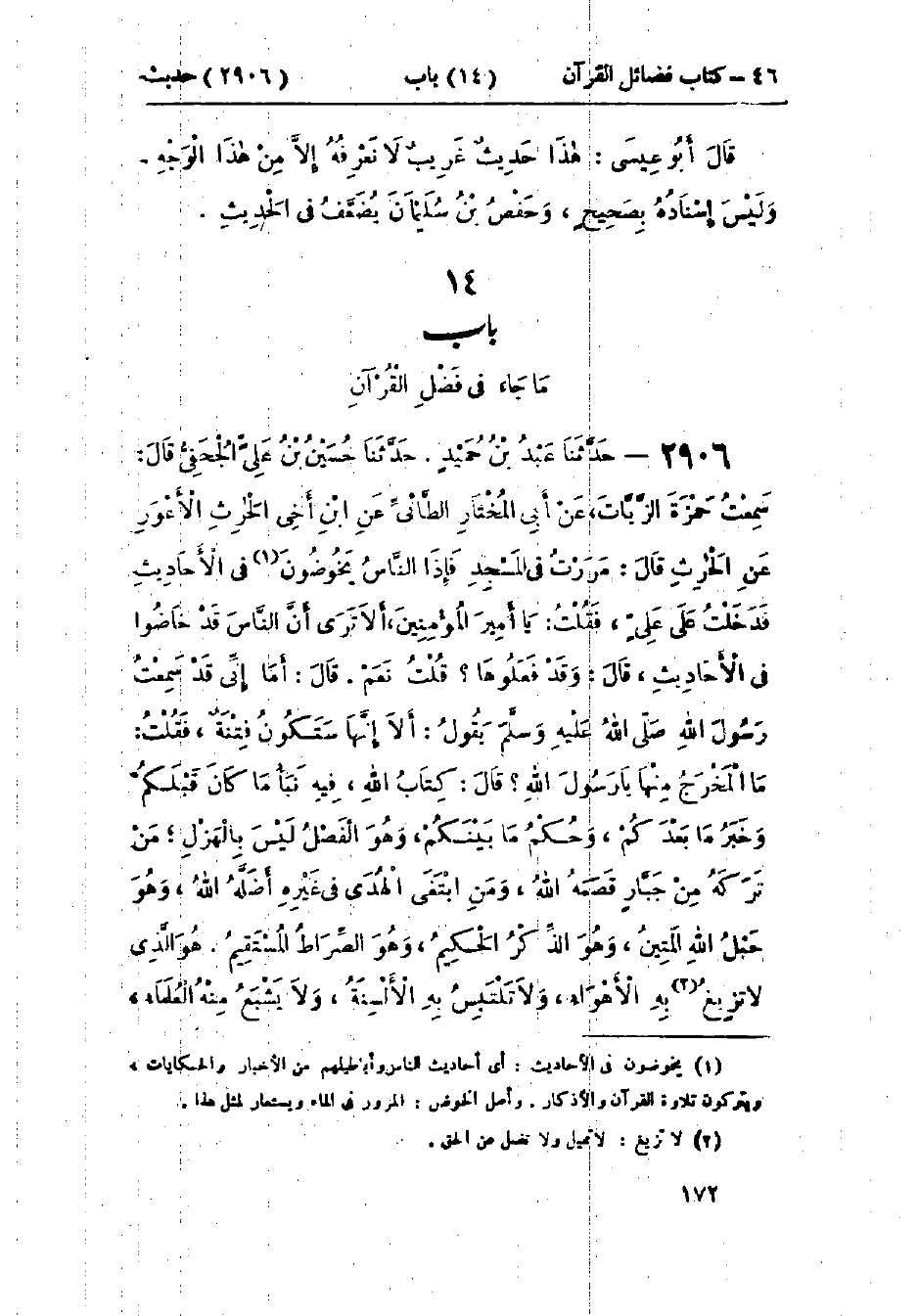 2906 - حَدَّثَنَا عَبْدُ بْنُ حُمَيْدٍ قَالَ: حَدَّثَنَا حُسَيْنُ بْنُ عَلِيٍّ الجُعْفِيُّ، قَالَ: سَمِعْتُ حَمْزَةَ الزَّيَّاتَ، عَنْ أَبِي المُخْتَارِ الطَّائِيِّ، عَنْ ابْنِ أَخِي الحَارِثِ الأَعْوَرِ، عَنْ الحَارِثِ، قَالَ: مَرَرْتُ فِي المَسْجِدِ فَإِذَا النَّاسُ يَخُوضُونَ فِي الأَحَادِيثِ فَدَخَلْتُ عَلَى عَلِيٍّ، فَقُلْتُ: يَا أَمِيرَ المُؤْمِنِينَ، أَلَا تَرَى أَنَّ النَّاسَ قَدْ خَاضُوا فِي الأَحَادِيثِ، قَالَ: وَقَدْ فَعَلُوهَا؟ قُلْتُ: نَعَمْ. قَالَ: أَمَا إِنِّي قَدْ سَمِعْتُ رَسُولَ اللَّهِ صَلَّى اللَّهُ عَلَيْهِ وَسَلَّمَ يَقُولُ: «§أَلَا إِنَّهَا سَتَكُونُ فِتْنَةٌ». فَقُلْتُ: مَا المَخْرَجُ مِنْهَا يَا رَسُولَ اللَّهِ؟ قَالَ: " كِتَابُ اللَّهِ فِيهِ نَبَأُ مَا قَبْلَكُمْ وَخَبَرُ مَا بَعْدَكُمْ، وَحُكْمُ مَا بَيْنَكُمْ، وَهُوَ الفَصْلُ لَيْسَ بِالهَزْلِ، مَنْ تَرَكَهُ مِنْ جَبَّارٍ قَصَمَهُ اللَّهُ، وَمَنْ ابْتَغَى الهُدَى فِي غَيْرِهِ أَضَلَّهُ اللَّهُ، وَهُوَ حَبْلُ اللَّهِ المَتِينُ، وَهُوَ الذِّكْرُ الحَكِيمُ، وَهُوَ الصِّرَاطُ المُسْتَقِيمُ، هُوَ الَّذِي لَا تَزِيغُ بِهِ الأَهْوَاءُ، وَلَا تَلْتَبِسُ بِهِ الأَلْسِنَةُ، وَلَا يَشْبَعُ مِنْهُ العُلَمَاءُ، -[173]- وَلَا يَخْلَقُ عَلَى كَثْرَةِ الرَّدِّ، وَلَا تَنْقَضِي عَجَائِبُهُ، هُوَ الَّذِي لَمْ تَنْتَهِ الجِنُّ إِذْ سَمِعَتْهُ حَتَّى قَالُوا: {إِنَّا سَمِعْنَا قُرْآنًا عَجَبًا يَهْدِي إِلَى الرُّشْدِ} [الجن: 2] مَنْ قَالَ بِهِ صَدَقَ، وَمَنْ عَمِلَ بِهِ أُجِرَ، وَمَنْ حَكَمَ بِهِ عَدَلَ، وَمَنْ دَعَا إِلَيْهِ هَدَى إِلَى صِرَاطٍ مُسْتَقِيمٍ " خُذْهَا إِلَيْكَ يَا أَعْوَرُ: «هَذَا حَدِيثٌ غَرِيبٌ لَا نَعْرِفُهُ إِلَّا مِنْ هَذَا الوَجْهِ وَإِسْنَادُهُ مَجْهُولٌ، وَفِي الحَارِثِ مَقَالٌ»
