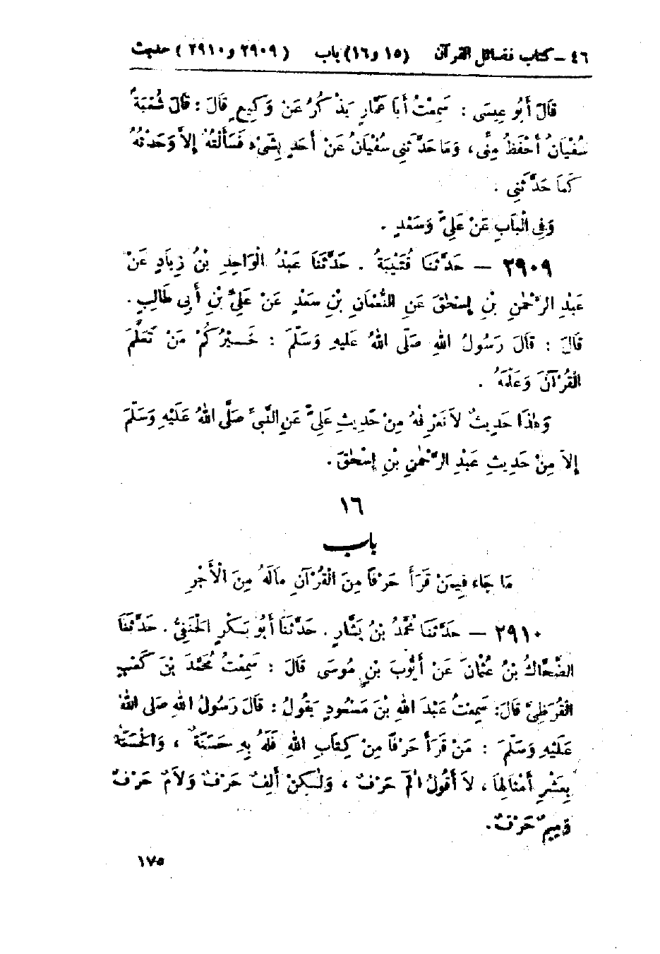 2910 - حَدَّثَنَا مُحَمَّدُ بْنُ بَشَّارٍ قَالَ: حَدَّثَنَا أَبُو بَكْرٍ الحَنَفِيُّ قَالَ: حَدَّثَنَا الضَّحَّاكُ بْنُ عُثْمَانَ، عَنْ أَيُّوبَ بْنِ مُوسَى، قَالَ: سَمِعْتُ مُحَمَّدَ بْنَ كَعْبٍ القُرَظِيَّ يَقُولُ: سَمِعْتُ عَبْدَ اللَّهِ بْنَ مَسْعُودٍ، يَقُولُ: قَالَ رَسُولُ اللَّهِ صَلَّى اللَّهُ عَلَيْهِ وَسَلَّمَ: «§مَنْ قَرَأَ حَرْفًا مِنْ كِتَابِ اللَّهِ فَلَهُ بِهِ حَسَنَةٌ، وَالحَسَنَةُ بِعَشْرِ أَمْثَالِهَا، لَا أَقُولُ الم حَرْفٌ، وَلَكِنْ أَلِفٌ حَرْفٌ وَلَامٌ حَرْفٌ وَمِيمٌ حَرْفٌ» -[176]- وَيُرْوَى هَذَا الحَدِيثُ مِنْ غَيْرِ هَذَا الوَجْهِ عَنْ ابْنِ مَسْعُودٍ «، رَوَاهُ أَبُو الأَحْوَصِ، عَنْ ابْنِ مَسْعُودٍ،» رَفَعَهُ بَعْضُهُمْ وَوَقَفَهُ بَعْضُهُمْ عَنْ ابْنِ مَسْعُودٍ "،: «هَذَا حَدِيثٌ حَسَنٌ صَحِيحٌ غَرِيبٌ مِنْ هَذَا الوَجْهِ» سَمِعْت قُتَيْبَةَ بْنَ سَعِيدٍ، يَقُولُ: «بَلَغَنِي أَنَّ مُحَمَّدَ بْنَ كَعْبٍ القُرَظِيَّ وُلِدَ فِي حَيَاةِ النَّبِيِّ صَلَّى اللَّهُ عَلَيْهِ وَسَلَّمَ» وَمُحَمَّدُ بْنُ كَعْبٍ يُكْنَى أَبَا حَمْزَةَ "