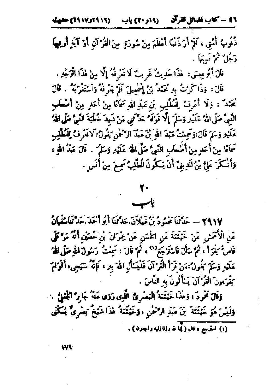 2917 - حَدَّثَنَا مَحْمُودُ بْنُ غَيْلَانَ قَالَ: حَدَّثَنَا أَبُو أَحْمَدَ قَالَ: حَدَّثَنَا سُفْيَانُ، عَنْ الأَعْمَشِ، عَنْ خَيْثَمَةَ، عَنْ الحَسَنِ، عَنْ عِمْرَانَ بْنِ حُصَيْنٍ، أَنَّهُ مَرَّ عَلَى قَارِئٍ يَقْرَأُ، ثُمَّ سَأَلَ فَاسْتَرْجَعَ، ثُمَّ قَالَ: سَمِعْتُ رَسُولَ اللَّهِ صَلَّى اللَّهُ عَلَيْهِ وَسَلَّمَ يَقُولُ: «§مَنْ قَرَأَ القُرْآنَ فَلْيَسْأَلِ اللَّهَ بِهِ، فَإِنَّهُ سَيَجِيءُ أَقْوَامٌ يَقْرَءُونَ القُرْآنَ يَسْأَلُونَ بِهِ النَّاسَ» وقَالَ مَحْمُودٌ: «هَذَا خَيْثَمَةُ البَصْرِيُّ الَّذِي رَوَى عَنْهُ جَابِرٌ الجُعْفِيُّ، وَلَيْسَ هُوَ خَيْثَمَةَ بْنَ عَبْدِ الرَّحْمَنِ. وَخَيْثَمَةُ هَذَا شَيْخٌ بَصْرِيٌّ يُكْنَى -[180]- أَبَا نَصْرٍ قَدْ رَوَى عَنْ أَنَسِ بْنِ مَالِكٍ أَحَادِيثَ، وَقَدْ رَوَى جَابِرٌ الجُعْفِيُّ، عَنْ خَيْثَمَةَ، هَذَا أَيْضًا أَحَادِيثَ»: «هَذَا حَدِيثٌ حَسَنٌ لَيْسَ إِسْنَادُهُ بِذَاكَ»