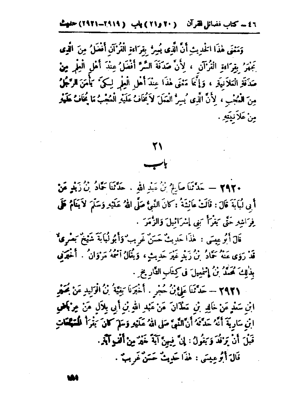 2921 - حَدَّثَنَا عَليُّ بْنُ حُجْرٍ قَالَ: أَخْبَرَنَا بَقِيَّةُ بْنُ الوَلِيدِ، عَنْ بَحِيرِ بْنِ سَعْدٍ، عَنْ خَالِدِ بْنِ مَعْدَانَ، عَنْ عَبْدِ اللَّهِ بْنِ أَبِي بِلَالٍ، عَنْ عِرْبَاضِ بْنِ سَارِيَةَ، أَنَّهُ حَدَّثَهُ أَنَّ النَّبِيَّ صَلَّى اللَّهُ عَلَيْهِ وَسَلَّمَ كَانَ يَقْرَأُ المُسَبِّحَاتِ قَبْلَ أَنْ يَرْقُدَ وَيَقُولُ: «إِنَّ §فِيهِنَّ آيَةً خَيْرٌ مِنْ أَلْفِ آيَةٍ»: «هَذَا حَدِيثٌ حَسَنٌ غَرِيبٌ»