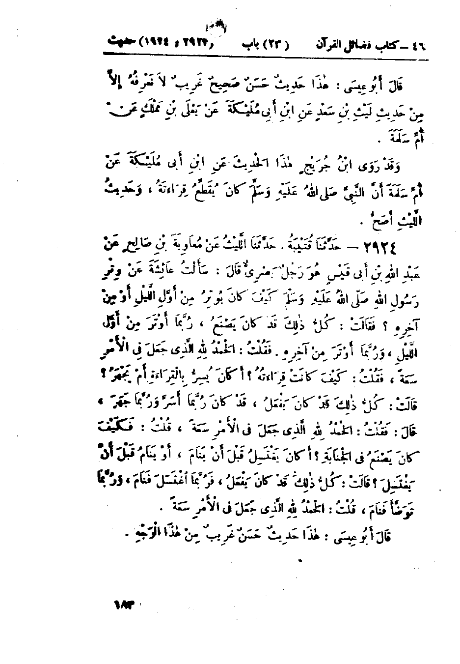 2924 - حَدَّثَنَا قُتَيْبَةُ قَالَ: حَدَّثَنَا اللَّيْثُ، عَنْ مُعَاوِيةَ بْنِ صَالِحٍ، عَنْ عَبْدِ اللَّهِ بْنِ أَبِي قَيْسٍ، قَالَ: سَأَلْتُ عَائِشَةَ، عَنْ وِتْرِ رَسُولِ اللَّهِ صَلَّى اللَّهُ عَلَيْهِ وَسَلَّمَ كَيْفَ كَانَ يُوتِرُ مِنْ أَوَّلِ اللَّيْلِ أَمْ مِنْ آخِرِهِ؟ فَقَالَتْ: «كُلُّ ذَلِكَ قَدْ كَانَ يَصْنَعُ، §رُبَّمَا أَوْتَرَ مِنْ أَوَّلِ اللَّيْلِ، وَرُبَّمَا أَوْتَرَ مِنْ آخِرِهِ». قُلْتُ: الحَمْدُ لِلَّهِ الَّذِي جَعَلَ فِي الأَمْرِ سَعَةً، فَقُلْتُ: كَيْفَ كَانَتْ قِرَاءَتُهُ؟ أَكَانَ يُسِرُّ بِالقِرَاءَةِ أَمْ يَجْهَرُ؟ قَالَتْ: «كُلُّ ذَلِكَ كَانَ يَفْعَلُ، قَدْ كَانَ رُبَّمَا أَسَرَّ وَرُبَّمَا جَهَرَ». قَالَ: فَقُلْتُ: الحَمْدُ لِلَّهِ الَّذِي جَعَلَ فِي الأَمْرِ سَعَةً قَالَ: قُلْتُ: فَكَيْفَ كَانَ يَصْنَعُ فِي الجَنَابَةِ؟ أَكَانَ يَغْتَسِلُ قَبْلَ أَنْ يَنَامَ، أَمْ يَنَامُ قَبْلَ أَنْ يَغْتَسِلَ؟ قَالَتْ: «كُلُّ ذَلِكَ قَدْ كَانَ يَفْعَلُ، فَرُبَّمَا اغْتَسَلَ فَنَامَ، وَرُبَّمَا تَوَضَّأَ فَنَامَ». قُلْتُ: الحَمْدُ لِلَّهِ الَّذِي جَعَلَ فِي الأَمْرِ سَعَةً: «هَذَا حَدِيثٌ حَسَنٌ غَرِيبٌ مِنْ هَذَا الوَجْهِ»