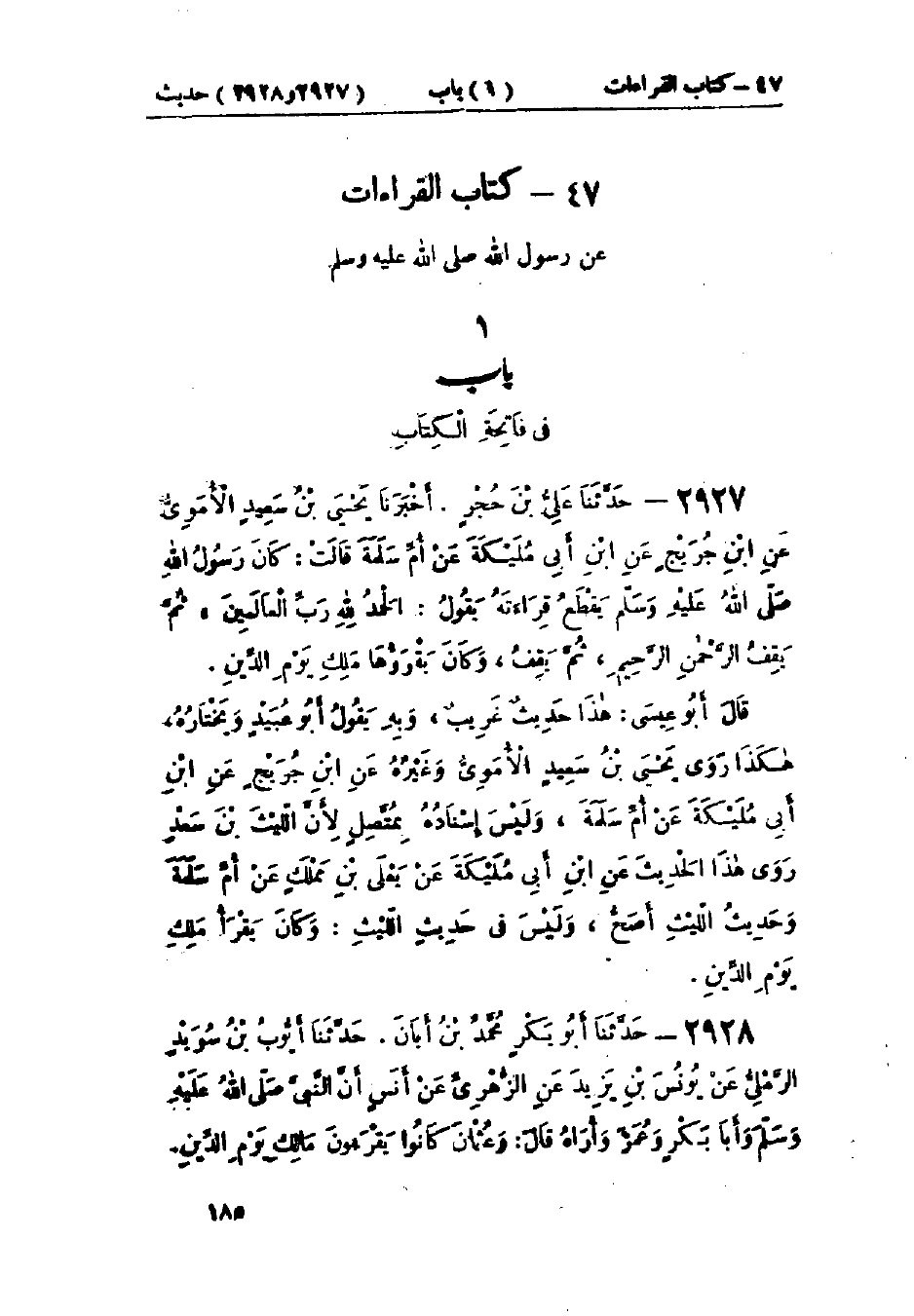 2927 - حَدَّثَنَا عَلِيُّ بْنُ حُجْرٍ قَالَ: أَخْبَرَنَا يَحْيَى بْنُ سَعِيدٍ الأُمَوِيُّ، عَنْ ابْنِ جُرَيْجٍ، عَنْ ابْنِ أَبِي مُلَيْكَةَ، عَنْ أُمِّ سَلَمَةَ، قَالَتْ: " كَانَ رَسُولُ اللَّهِ صَلَّى اللَّهُ عَلَيْهِ وَسَلَّمَ §يُقَطِّعُ قِرَاءَتَهُ يَقْرَأُ: {الْحَمْدُ لِلَّهِ رَبِّ الْعَالَمِينَ} [الفاتحة: 2]، ثُمَّ يَقِفُ، {الرَّحْمَنِ الرَّحِيمِ} [الفاتحة: 1]، ثُمَّ يَقِفُ، وَكَانَ يَقْرَؤُهَا: (مَلِكِ يَوْمِ الدِّينِ) ". هَذَا حَدِيثٌ غَرِيبٌ وَبِهِ يَقْرَأُ أَبُو عُبَيْدٍ وَيَخْتَارُهُ. هَكَذَا رَوَى يَحْيَى بْنُ سَعِيدٍ الأُمَوِيُّ، وَغَيْرُهُ عَنْ ابْنِ جُرَيْجٍ، عَنْ ابْنِ أَبِي مُلَيْكَةَ، عَنْ أُمِّ سَلَمَةَ، وَلَيْسَ إِسْنَادُهُ بِمُتَّصِلٍ لِأَنَّ اللَّيْثَ بْنَ سَعْدٍ، رَوَى هَذَا الحَدِيثَ عَنْ ابْنِ أَبِي مُلَيْكَةَ، عَنْ يَعْلَى بْنِ مَمْلَكٍ، عَنْ أُمِّ سَلمَةَ. وَحَدِيثُ اللَّيْثِ أَصَحُّ، وَلَيْسَ فِي حَدِيثِ اللَّيْثِ: وَكَانَ يَقْرَأُ (مَلِكِ يَوْمِ الدِّينِ)