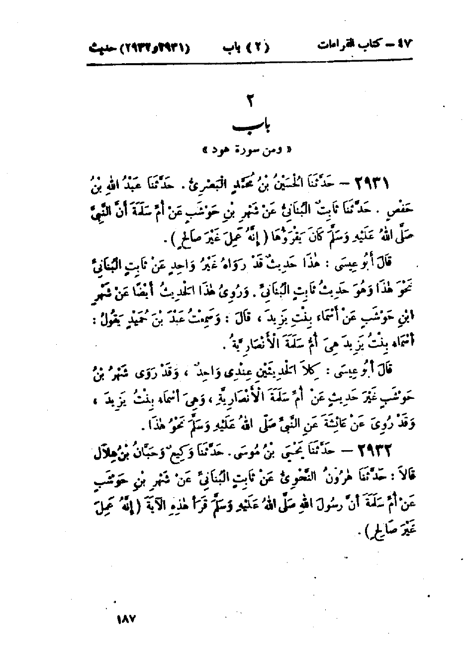 2931 - حَدَّثَنَا الحُسَيْنُ بْنُ مُحَمَّدٍ البَصْرِيُّ قَالَ: حَدَّثَنَا عَبْدُ اللَّهِ بْنُ حَفْصٍ قَالَ: حَدَّثَنَا ثَابِتٌ البُنَانِيُّ، عَنْ شَهْرِ بْنِ حَوْشَبٍ، عَنْ أُمِّ سَلَمَةَ: «أَنَّ النَّبِيَّ صَلَّى اللَّهُ عَلَيْهِ وَسَلَّمَ كَانَ §يَقْرَؤُهَا (إِنَّهُ عَمِلَ غَيْرَ صَالِحٍ)»: «هَذَا حَدِيثٌ قَدْ رَوَاهُ غَيْرُ وَاحِدٍ عَنْ ثَابِتٍ البُنَانِيِّ، نَحْوَ هَذَا وَهُوَ حَدِيثُ ثَابِتٍ البُنَانِيِّ» وَرُوِيَ هَذَا الْحَدِيثُ أَيْضًا عَنْ شَهْرِ بْنِ حَوْشَبٍ، عَنْ أَسْمَاءَ بِنْتِ يَزِيدَ، قَالَ: وسَمِعْت عَبْدَ بْنَ حُمَيْدٍ، يَقُولُ: «أَسْمَاءُ بِنْتُ يَزِيدَ هِيَ أُمُّ سَلَمَةَ الأَنْصَارِيَّةُ»: «كِلَا الحَدِيثَيْنِ عِنْدِي وَاحِدٌ، وَقَدْ رَوَى شَهْرُ بْنُ حَوْشَبٍ غَيْرَ حَدِيثٍ عَنْ أُمِّ سَلَمَةَ الأَنْصَارِيَّةِ وَهِيَ أَسْمَاءُ بِنْتُ يَزِيدَ»، وَقَدْ رُوِيَ عَنْ عَائِشَةَ، عَنِ النَّبِيِّ صَلَّى اللَّهُ عَلَيْهِ وَسَلَّمَ نَحْوُ هَذَا