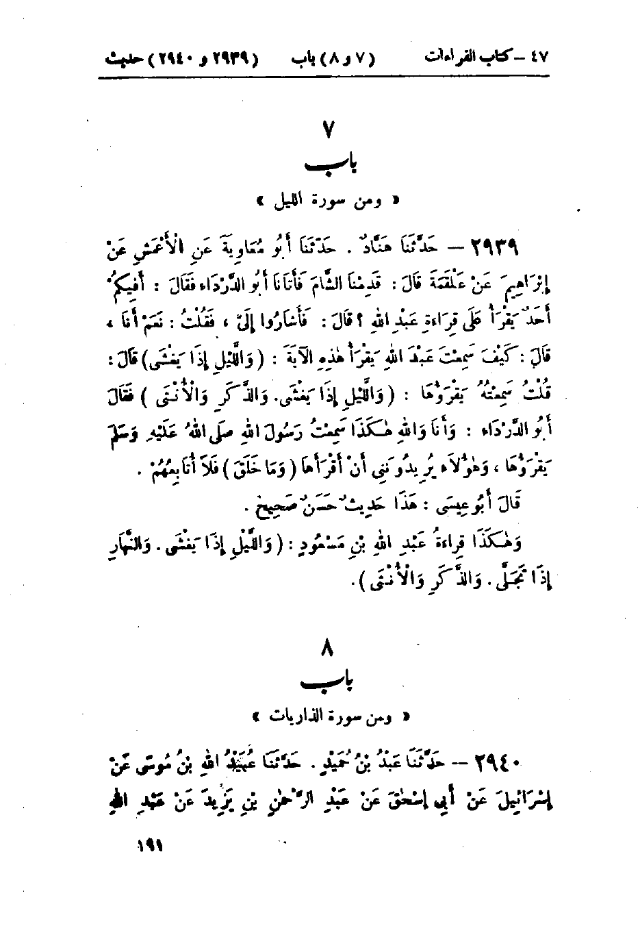 2939 - حَدَّثَنَا هَنَّادٌ قَالَ: حَدَّثَنَا أَبُو مُعَاوِيَةَ، عَنْ الأَعْمَشِ، عَنْ إِبْرَاهِيمَ، عَنْ عَلْقَمَةَ، قَالَ: قَدِمْنَا الشَّامَ فَأَتَانَا أَبُو الدَّرْدَاءِ، فَقَالَ: أَفِيكُمْ أَحَدٌ يَقْرَأُ عَلَيَّ قِرَاءَةَ عَبْدِ اللَّهِ؟ قَالَ: فَأَشَارُوا إِلَيَّ، فَقُلْتُ: نَعَمْ أَنَا، قَالَ: كَيْفَ سَمِعْتَ عَبْدَ اللَّهِ، يَقْرَأُ هَذِهِ الآيَةَ {وَاللَّيْلِ إِذَا يَغْشَى} [الليل: 1]؟ قَالَ: قُلْتُ: " سَمِعْتُهُ §يَقْرَؤُهَا: {وَاللَّيْلِ إِذَا يَغْشَى} [الليل: 1] وَالذَّكَرِ وَالأُنْثَى "، فَقَالَ أَبُو الدَّرْدَاءِ: «وَأَنَا وَاللَّهِ هَكَذَا سَمِعْتُ رَسُولَ اللَّهِ صَلَّى اللَّهُ عَلَيْهِ وَسَلَّمَ وَهُوَ يَقْرَؤُهَا»، وَهَؤُلَاءِ يُرِيدُونَنِي أَنْ أَقْرَأَهَا {وَمَا خَلَقَ} [الليل: 3] فَلَا أُتَابِعُهُمْ: " هَذَا حَدِيثٌ حَسَنٌ صَحِيحٌ وَهَكَذَا قِرَاءَةُ عَبْدِ اللَّهِ بْنِ مَسْعُودٍ {وَاللَّيْلِ إِذَا يَغْشَى وَالنَّهَارِ إِذَا تَجَلَّى} [الليل: 2] وَالذَّكَرِ وَالأُنْثَى "