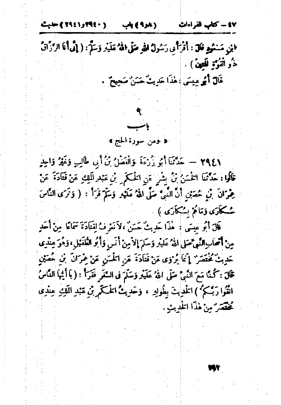 2941 - حَدَّثَنَا أَبُو زُرْعَةَ، وَالفَضْلُ بْنُ أَبِي طَالِبٍ وَغَيْرُ وَاحِدٍ، قَالُوا: حَدَّثَنَا الحَسَنُ بْنُ بِشْرٍ، عَنْ الحَكَمِ بْنِ عَبْدِ المَلِكِ، عَنْ قَتَادَةَ، عَنْ عِمْرَانَ بْنِ حُصَيْنٍ: " أَنَّ النَّبِيَّ صَلَّى اللَّهُ عَلَيْهِ وَسَلَّمَ §قَرَأَ: {وَتَرَى النَّاسَ سُكَارَى وَمَا هُمْ بِسُكَارَى} [الحج: 2] ": «هَذَا حَدِيثٌ حَسَنٌ، وَهَكَذَا رَوَى الْحَكَمُ بْنُ عَبْدِ الْمَلِكِ، عَنْ قَتَادَةَ، وَلَا نَعْرِفُ لِقَتَادَةَ سَمَاعًا مِنْ أَحَدٍ مِنْ أَصْحَابِ النَّبِيِّ صَلَّى اللَّهُ عَلَيْهِ وَسَلَّمَ إِلَّا مِنْ أَنَسٍ وَأَبِي الطُّفَيْلِ، وَهَذَا عِنْدِي حَدِيثٌ مُخْتَصَرٌ» إِنَّمَا يُرْوَى عَنْ قَتَادَةَ، عَنِ الحَسَنِ، عَنْ عِمْرَانَ بْنِ حُصَيْنٍ، قَالَ: " كُنَّا مَعَ النَّبِيِّ صَلَّى اللَّهُ عَلَيْهِ وَسَلَّمَ فِي السَّفَرِ، فَقَرَأَ: {يَا أَيُّهَا النَّاسُ اتَّقُوا رَبَّكُمْ} [لقمان: 33] الحَدِيثَ بِطُولِهِ، «وَحَدِيثُ الحَكَمِ بْنِ عَبْدِ المَلِكِ عِنْدِي مُخْتَصَرٌ مِنْ هَذَا الحَدِيثِ»