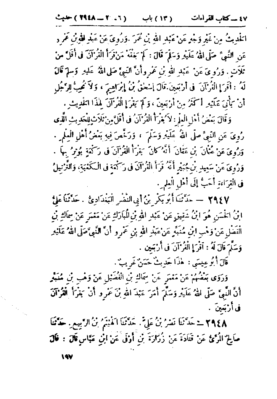 2947 - حَدَّثَنَا أَبُو بَكْرِ بْنُ أَبِي النَّضْرِ البَغْدَادِيُّ قَالَ: حَدَّثَنَا عَلِيُّ بْنُ الحَسَنِ هُوَ ابْنُ شَقِيقٍ، عَنْ عَبْدِ اللَّهِ بْنِ المُبَارَكِ، عَنْ مَعْمَرٍ، عَنْ سِمَاكِ بْنِ الفَضْلِ، عَنْ وَهْبِ بْنِ مُنَبِّهٍ، عَنْ عَبْدِ اللَّهِ بْنِ عَمْرٍو، أَنَّ النَّبِيَّ صَلَّى اللَّهُ عَلَيْهِ وَسَلَّمَ قَالَ لَهُ: «§اقْرَأِ القُرْآنَ فِي أَرْبَعِينَ». هَذَا حَدِيثٌ حَسَنٌ غَرِيبٌ. وَقَدْ رَوَى بَعْضُهُمْ عَنْ مَعْمَرٍ، عَنْ سِمَاكِ بْنِ الفَضْلِ، عَنْ وَهْبِ بْنِ مُنَبِّهٍ، «أَنَّ النَّبِيَّ صَلَّى اللَّهُ عَلَيْهِ وَسَلَّمَ أَمَرَ عَبْدَ اللَّهِ بْنَ عَمْرٍو أَنْ يَقْرَأَ القُرْآنَ فِي أَرْبَعِينَ»