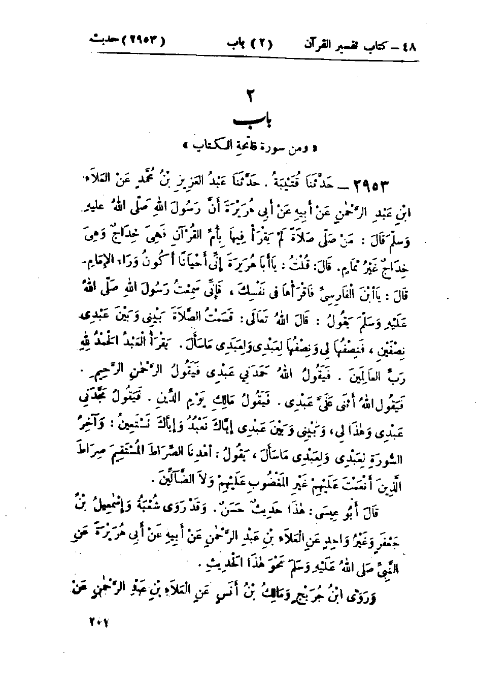 2953 - فَإِنِّي سَمِعْتُ رَسُولَ اللَّهِ صَلَّى اللَّهُ عَلَيْهِ وَسَلَّمَ يَقُولُ: " قَالَ اللَّهُ تَعَالَى: §قَسَمْتُ الصَّلَاةَ بَيْنِي وَبَيْنَ عَبْدِي نِصْفَيْنِ، فَنِصْفُهَا لِي وَنِصْفُهَا لِعَبْدِي، وَلِعَبْدِي مَا سَأَلَ. يَقُومُ الْعَبْدُ فَيَقُولُ: {الحَمْدُ لِلَّهِ رَبِّ العَالَمِينَ} [الفاتحة: 2] فَيَقُولُ اللَّهُ: حَمِدَنِي عَبْدِي. فَيَقُولُ {الرَّحْمَنِ الرَّحِيمِ} [الفاتحة: 1] فَيَقُولُ اللَّهُ: أَثْنَى عَلَيَّ عَبْدِي. فَيَقُولُ {مَالِكِ يَوْمِ الدِّينِ} فَيَقُولُ: مَجَّدَنِي عَبْدِي وَهَذَا لِي، وَبَيْنِي وَبَيْنَ عَبْدِي {إِيَّاكَ نَعْبُدُ وَإِيَّاكَ نَسْتَعِينُ} [الفاتحة: 5] وَآخِرُ السُّورَةِ لِعَبْدِي، وَلِعَبْدِي مَا سَأَلَ، يَقُولُ: {اهْدِنَا الصِّرَاطَ المُسْتَقِيمَ صِرَاطَ الَّذِينَ أَنْعَمْتَ عَلَيْهِمْ غَيْرِ المَغْضُوبِ عَلَيْهِمْ وَلَا الضَّالِّينَ} [الفاتحة: 7] ": «هَذَا حَدِيثٌ حَسَنٌ» وَقَدْ رَوَى شُعْبَةُ، وَإِسْمَاعِيلُ بْنُ جَعْفَرٍ، وَغَيْرُ وَاحِدٍ عَنِ العَلَاءِ بْنِ عَبْدِ الرَّحْمَنِ، عَنْ أَبِيهِ، عَنْ أَبِي هُرَيْرَةَ، عَنِ النَّبِيِّ صَلَّى اللَّهُ عَلَيْهِ وَسَلَّمَ نَحْوَ هَذَا الحَدِيثِ، وَرَوَى ابْنُ جُرَيْجٍ، وَمَالِكُ بْنُ أَنَسٍ، عَنِ العَلَاءِ بْنِ عَبْدِ الرَّحْمَنِ، عَنْ -[202]- أَبِي السَّائِبِ، مَوْلَى هِشَامِ بْنِ زُهْرَةَ، عَنْ أَبِي هُرَيْرَةَ، عَنِ النَّبِيِّ صَلَّى اللَّهُ عَلَيْهِ وَسَلَّمَ نَحْوَ هَذَا، وَرَوَى ابْنُ أَبِي أُوَيْسٍ، عَنْ أَبِيهِ، عَنِ العَلَاءِ بْنِ عَبْدِ الرَّحْمَنِ، قَالَ: حَدَّثَنِي أَبِي، وَأَبُو السَّائِبِ، عَنْ أَبِي هُرَيْرَةَ عَنِ النَّبِيِّ صَلَّى اللَّهُ عَلَيْهِ وَسَلَّمَ نَحْوَ هَذَا