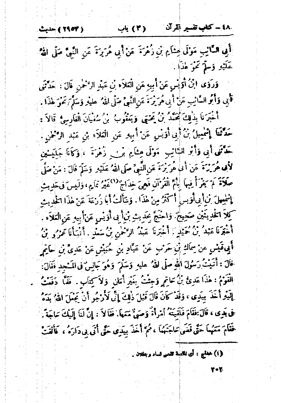 2953 - حَدَّثَنَا بِذَلِكَ مُحَمَّدُ بْنُ يَحْيَى، وَيَعْقُوبُ بْنُ سُفْيَانَ الفَارِسِيُّ، قَالَا: حَدَّثَنَا إِسْمَاعِيلُ بْنُ أَبِي أُوَيْسٍ، عَنْ أَبِيهِ، عَنِ العَلَاءِ بْنِ عَبْدِ الرَّحْمَنِ قَالَ: حَدَّثَنِي أَبِي، وَأَبُو السَّائِبِ، مَوْلَى هِشَامِ بْنِ زُهْرَةَ - وَكَانَا جَلِيسَيْنِ لِأَبِي هُرَيْرَةَ - عَنْ أَبِي هُرَيْرَةَ، عَنِ النَّبِيِّ صَلَّى اللَّهُ عَلَيْهِ وَسَلَّمَ قَالَ: «§مَنْ صَلَّى صَلَاةً لَمْ يَقْرَأْ فِيهَا بِأُمِّ القُرْآنِ فَهِيَ خِدَاجٌ، فَهِيَ خِدَاجٌ، غَيْرُ تَمَامٍ» وَلَيْسَ فِي حَدِيثِ إِسْمَاعِيلَ بْنِ أَبِي أُوَيْسٍ أَكْثَرُ مِنْ هَذَا " وَسَأَلْتُ أَبَا زُرْعَةَ عَنْ هَذَا الحَدِيثِ، فَقَالَ: كِلَا الحَدِيثَيْنِ صَحِيحٌ، وَاحْتَجَّ بِحَدِيثِ ابْنِ أَبِي أُوَيْسٍ، عَنْ أَبِيهِ، عَنِ العَلَاءِ "