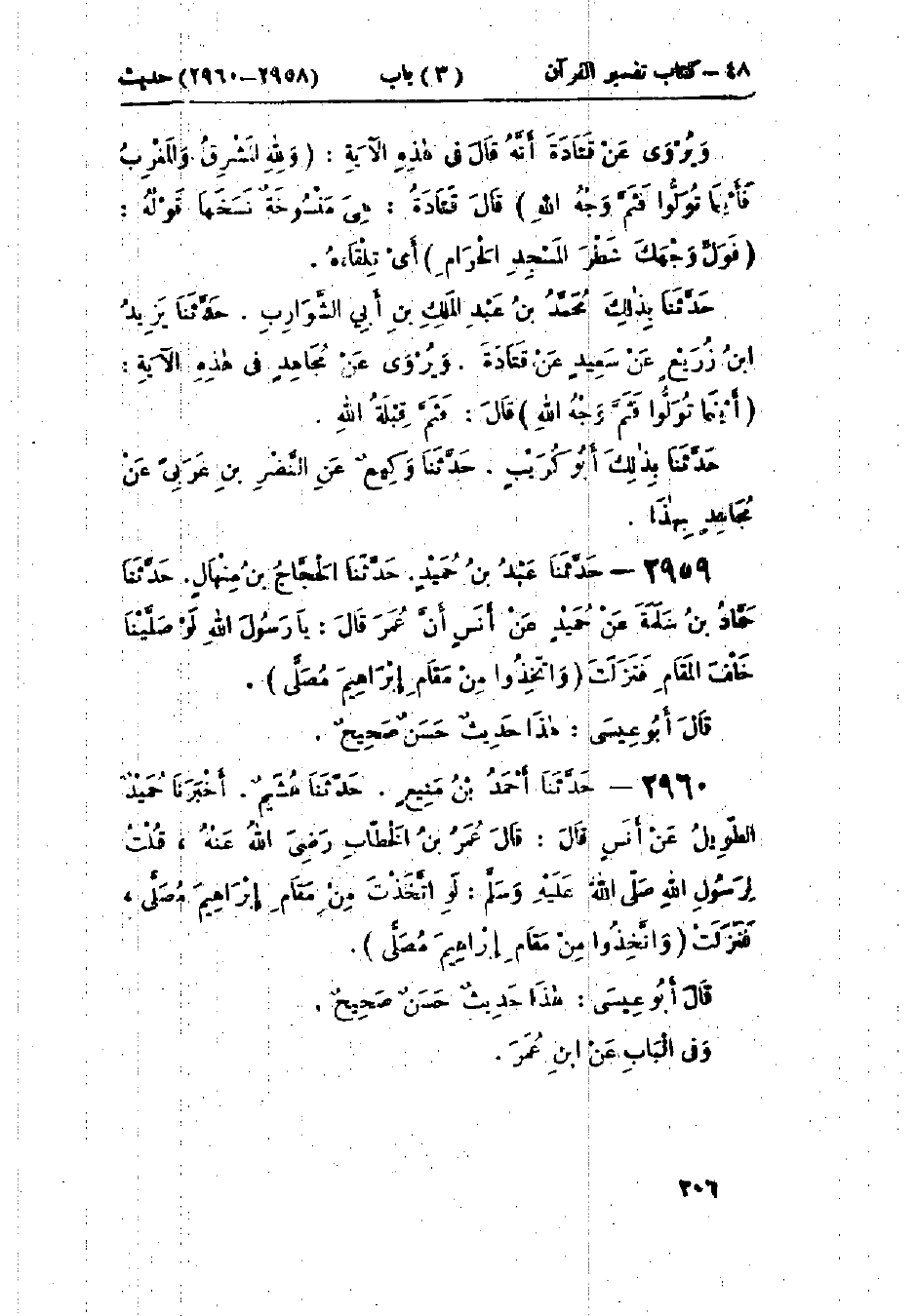 2960 - حَدَّثَنَا أَحْمَدُ بْنُ مَنِيعٍ قَالَ: حَدَّثَنَا هُشَيْمٌ قَالَ: حَدَّثَنَا حُمَيْدٌ الطَّوِيلُ، عَنْ أَنَسٍ، قَالَ: قَالَ عُمَرُ بْنُ الخَطَّابِ: قُلْتُ يَا رَسُولَ اللَّهِ: " لَوِ اتَّخَذْتَ مِنْ مَقَامِ إِبْرَاهِيمَ مُصَلًّى، فَنَزَلَتْ {§وَاتَّخِذُوا مِنْ مَقَامِ إِبْرَاهِيمَ مُصَلًّى} [البقرة: 125] ": «هَذَا حَدِيثٌ حَسَنٌ صَحِيحٌ» وَفِي البَابِ عَنْ ابْنِ عُمَرَ
