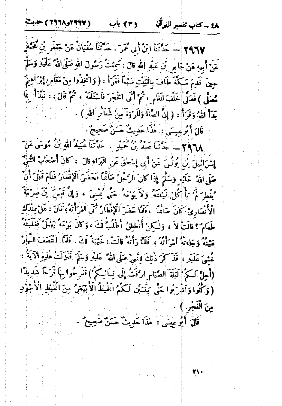 2967 - حَدَّثَنَا ابْنُ أَبِي عُمَرَ قَالَ: حَدَّثَنَا سُفْيَانُ، عَنْ جَعْفَرِ بْنِ مُحَمَّدٍ، عَنْ أَبِيهِ، عَنْ جَابِرِ بْنِ عَبْدِ اللَّهِ، قَالَ: سَمِعْتُ رَسُولَ اللَّهِ صَلَّى اللَّهُ عَلَيْهِ وَسَلَّمَ حِينَ قَدِمَ مَكَّةَ §طَافَ بِالبَيْتِ سَبْعًا فَقَرَأَ: {وَاتَّخِذُوا مِنْ مَقَامِ إِبْرَاهِيمَ مُصَلًّى} [البقرة: 125] فَصَلَّى خَلْفَ المَقَامِ، ثُمَّ أَتَى الحَجَرَ فَاسْتَلَمَهُ، ثُمَّ قَالَ: «نَبْدَأُ بِمَا بَدَأَ اللَّهُ» وَقَرَأَ: {إِنَّ الصَّفَا وَالمَرْوَةَ مِنْ شَعَائِرِ اللَّهِ} [البقرة: 158]: «هَذَا حَدِيثٌ حَسَنٌ صَحِيحٌ»