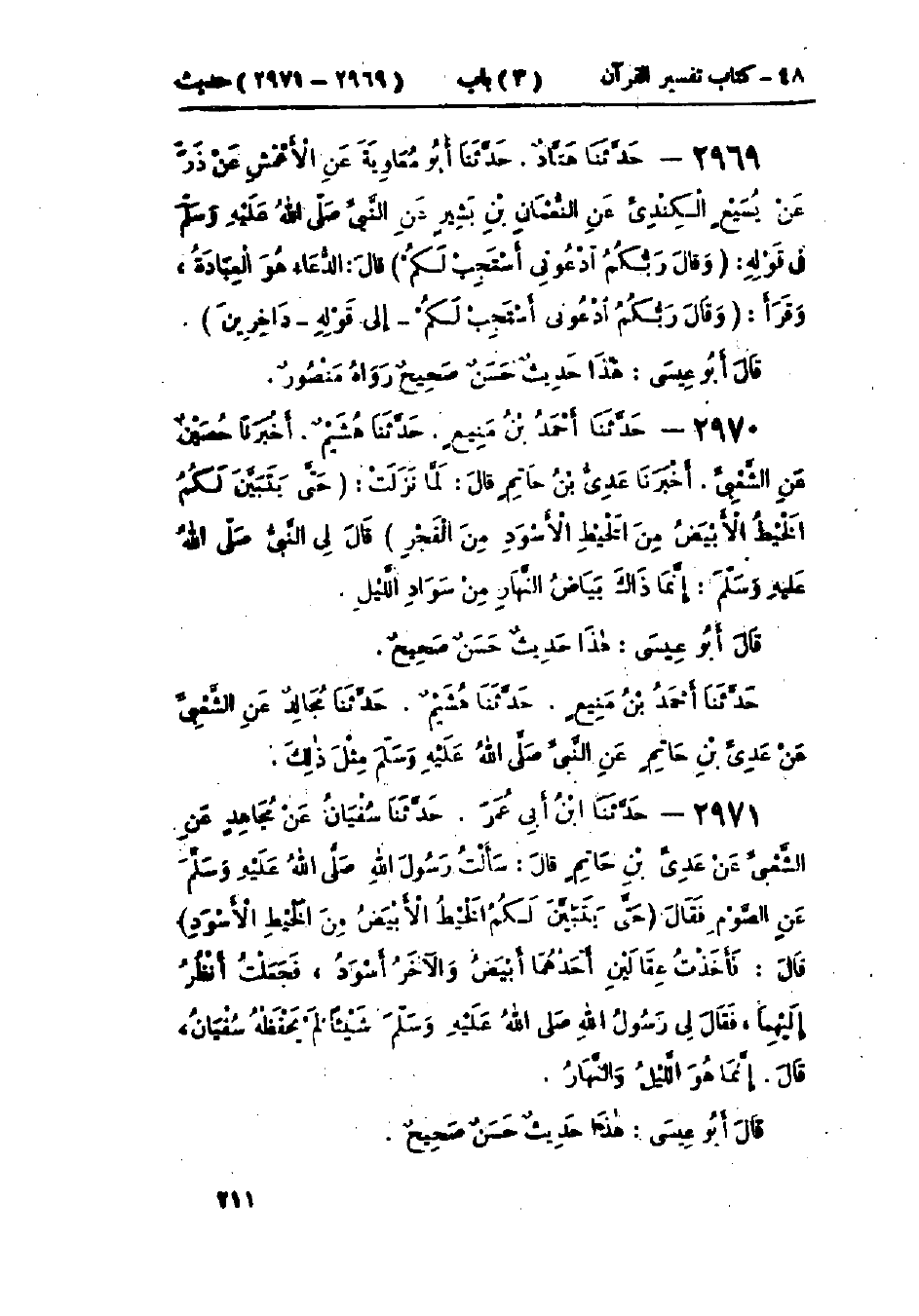 2970 - حَدَّثَنَا أَحْمَدُ بْنُ مَنِيعٍ قَالَ: حَدَّثَنَا هُشَيْمٌ قَالَ: أَخْبَرَنَا حُصَيْنٌ، عَنْ الشَّعْبِيِّ قَالَ: أَخْبَرَنَا عَدِيُّ بْنُ حَاتِمٍ، قَالَ: لَمَّا نَزَلَتْ: {§حَتَّى يَتَبَيَّنَ لَكُمُ الخَيْطُ الأَبْيَضُ مِنَ الخَيْطِ الأَسْوَدِ مِنَ الفَجْرِ} [البقرة: 187] قَالَ لِيَ النَّبِيُّ صَلَّى اللَّهُ عَلَيْهِ وَسَلَّمَ: «إِنَّمَا ذَلِكَ بَيَاضُ النَّهَارِ مِنْ سَوَادِ اللَّيْلِ»: «هَذَا حَدِيثٌ حَسَنٌ صَحِيحٌ» حَدَّثَنَا أَحْمَدُ بْنُ مَنِيعٍ قَالَ: حَدَّثَنَا هُشَيْمٌ قَالَ: حَدَّثَنَا مُجَالِدٌ، عَنِ الشَّعْبِيِّ، عَنْ عَدِيِّ بْنِ حَاتِمٍ، عَنِ النَّبِيِّ صَلَّى اللَّهُ عَلَيْهِ وَسَلَّمَ مِثْلَ ذَلِكَ