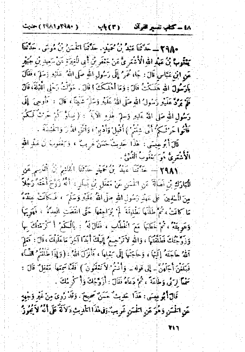 2980 - حَدَّثَنَا عَبْدُ بْنُ حُمَيْدٍ قَالَ: حَدَّثَنَا الحَسَنُ بْنُ مُوسَى قَالَ: حَدَّثَنَا يَعْقُوبُ بْنُ عَبْدِ اللَّهِ الأَشْعَرِيُّ، عَنْ جَعْفَرِ بْنِ أَبِي المُغِيرَةِ، عَنْ سَعِيدِ بْنِ جُبَيْرٍ، عَنْ ابْنِ عَبَّاسٍ، قَالَ: جَاءَ عُمَرُ إِلَى رَسُولِ اللَّهِ صَلَّى اللَّهُ عَلَيْهِ وَسَلَّمَ فَقَالَ: يَا رَسُولَ اللَّهِ هَلَكْتُ قَالَ: «§وَمَا أَهْلَكَكَ»؟ قَالَ: حَوَّلْتُ رَحْلِي اللَّيْلَةَ، قَالَ: فَلَمْ يَرُدَّ عَلَيْهِ رَسُولُ اللَّهِ صَلَّى اللَّهُ عَلَيْهِ وَسَلَّمَ شَيْئًا، قَالَ: فَأُوحِيَ إِلَى رَسُولِ اللَّهِ صَلَّى اللَّهُ عَلَيْهِ وَسَلَّمَ هَذِهِ الْآيَةُ: {نِسَاؤُكُمْ حَرْثٌ لَكُمْ فَأْتُوا حَرْثَكُمْ أَنَّى شِئْتُمْ} [البقرة: 223] أَقْبِلْ وَأَدْبِرْ، وَاتَّقِ الدُّبُرَ وَالحَيْضَةَ: " هَذَا حَدِيثٌ حَسَنٌ غَرِيبٌ، وَيَعْقُوبُ بْنُ عَبْدِ اللَّهِ الأَشْعَرِيُّ هُوَ: يَعْقُوبُ القُمِّيُّ "