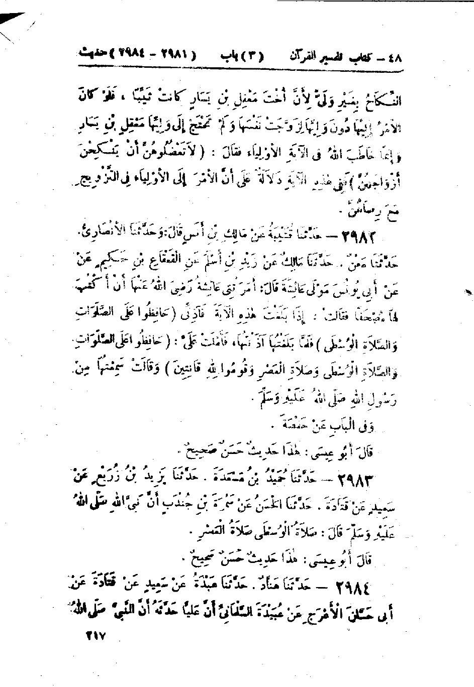2983 - حَدَّثَنَا حُمَيْدُ بْنُ مَسْعَدَةَ قَالَ: حَدَّثَنَا يَزِيدُ بْنُ زُرَيْعٍ، عَنْ سَعِيدٍ، عَنْ قَتَادَةَ قَالَ: حَدَّثَنَا الحَسَنُ، عَنْ سَمُرَةَ بْنِ جُنْدَبٍ، أَنَّ نَبِيَّ اللَّهِ صَلَّى اللَّهُ عَلَيْهِ وَسَلَّمَ قَالَ: «§صَلَاةُ الوُسْطَى صَلَاةُ العَصْرِ»: «هَذَا حَدِيثٌ حَسَنٌ صَحِيحٌ»