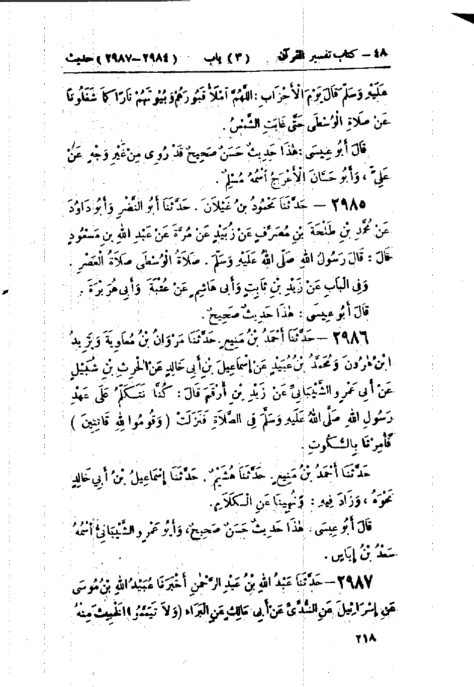 2986 - حَدَّثَنَا أَحْمَدُ بْنُ مَنِيعٍ قَالَ: حَدَّثَنَا مَرْوَانُ بْنُ مُعَاوِيَةَ، وَيَزِيدُ بْنُ هَارُونَ، وَمُحَمَّدُ بْنُ عُبَيْدٍ، عَنْ إِسْمَاعِيلَ بْنِ أَبِي خَالِدٍ، عَنْ الحَارِثِ بْنِ شُبَيْلٍ، عَنْ أَبِي عَمْرٍو الشَّيْبَانِيِّ، عَنْ زَيْدِ بْنِ أَرْقَمَ، قَالَ: " §كُنَّا نَتَكَلَّمُ عَلَى عَهْدِ رَسُولِ اللَّهِ صَلَّى اللَّهُ عَلَيْهِ وَسَلَّمَ فِي الصَّلَاةِ فَنَزَلَتْ {وَقُومُوا لِلَّهِ قَانِتِينَ} [البقرة: 238] فَأُمِرْنَا بِالسُّكُوتِ " حَدَّثَنَا أَحْمَدُ بْنُ مَنِيعٍ قَالَ: حَدَّثَنَا هُشَيْمٌ قَالَ: حَدَّثَنَا إِسْمَاعِيلُ بْنُ أَبِي خَالِدٍ، نَحْوَهُ، وَزَادَ فِيهِ: «وَنُهِينَا عَنِ الكَلَامِ»: " هَذَا حَدِيثٌ حَسَنٌ صَحِيحٌ، وَأَبُو عَمْرٍو الشَّيْبَانِيُّ اسْمُهُ: سَعْدُ بْنُ إِيَاسٍ "