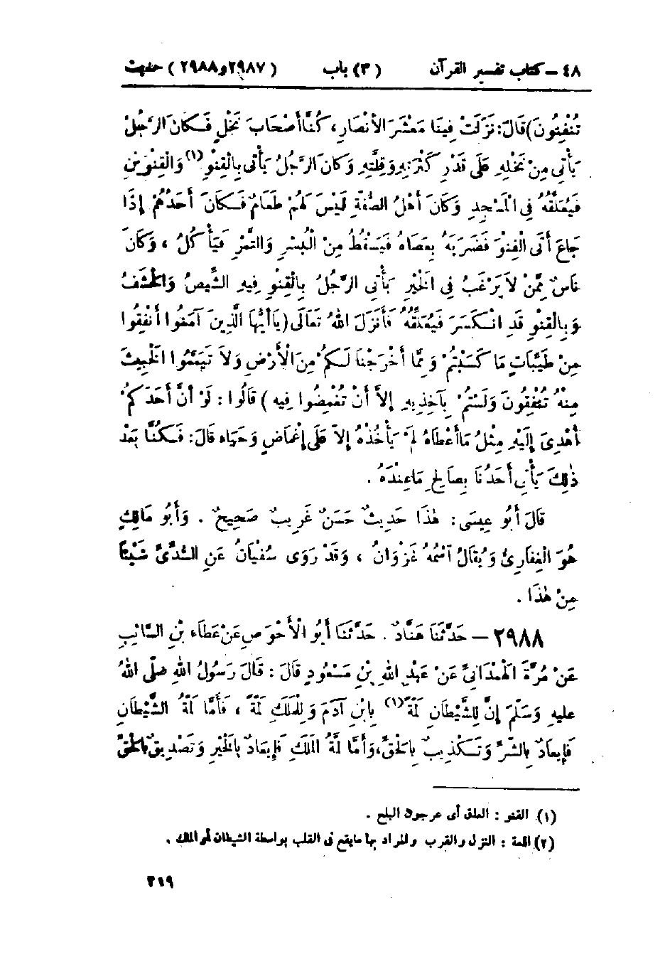 2988 - حَدَّثَنَا هَنَّادٌ قَالَ: حَدَّثَنَا أَبُو الأَحْوَصِ، عَنْ عَطَاءِ بْنِ السَّائِبِ، عَنْ مُرَّةَ الهَمْدَانِيِّ، عَنْ عَبْدِ اللَّهِ بْنِ مَسْعُودٍ، قَالَ: قَالَ رَسُولُ اللَّهِ صَلَّى اللَّهُ عَلَيْهِ وَسَلَّمَ: «إِنَّ §لِلشَّيْطَانِ لَمَّةً بِابْنِ آدَمَ وَلِلْمَلَكِ لَمَّةً فَأَمَّا لَمَّةُ الشَّيْطَانِ فَإِيعَادٌ بِالشَّرِّ وَتَكْذِيبٌ بِالحَقِّ، وَأَمَّا لَمَّةُ المَلَكِ فَإِيعَادٌ بِالخَيْرِ وَتَصْدِيقٌ بِالحَقِّ، -[220]- فَمَنْ وَجَدَ ذَلِكَ فَلْيَعْلَمْ أَنَّهُ مِنَ اللَّهِ فَلْيَحْمَدِ اللَّهَ وَمَنْ وَجَدَ الأُخْرَى فَلْيَتَعَوَّذْ بِاللَّهِ مِنَ الشَّيْطَانِ الرَّجِيمِ»، ثُمَّ قَرَأَ {الشَّيْطَانُ يَعِدُكُمُ الفَقْرَ وَيَأْمُرُكُمْ بِالفَحْشَاءِ} [البقرة: 268] الآيَةَ: «هَذَا حَدِيثٌ حَسَنٌ غَرِيبٌ وَهُوَ حَدِيثُ أَبِي الأَحْوَصِ لَا نَعْرِفُهُ مَرْفُوعًا إِلَّا مِنْ حَدِيثِ أَبِي الأَحْوَصِ»