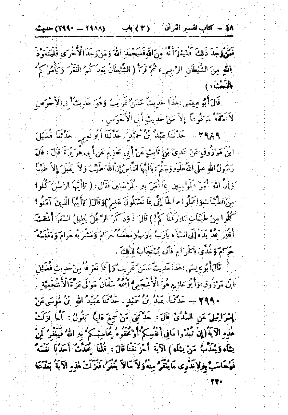 2989 - حَدَّثَنَا عَبْدُ بْنُ حُمَيْدٍ قَالَ: حَدَّثَنَا أَبُو نُعَيْمٍ قَالَ: حَدَّثَنَا فُضَيْلُ بْنُ مَرْزُوقٍ، عَنْ عَدِيِّ بْنِ ثَابِتٍ، عَنْ أَبِي حَازِمٍ، عَنْ أَبِي هُرَيْرَةَ، قَالَ: قَالَ رَسُولُ اللَّهِ صَلَّى اللَّهُ عَلَيْهِ وَسَلَّمَ: «يَا أَيُّهَا النَّاسُ، إِنَّ §اللَّهَ طَيِّبٌ وَلَا يَقْبَلُ إِلَّا طَيِّبًا وَإِنَّ اللَّهَ أَمَرَ المُؤْمِنِينَ بِمَا أَمَرَ بِهِ المُرْسَلِينَ»، فَقَالَ: {يَا أَيُّهَا الرُّسُلُ كُلُوا مِنَ الطَّيِّبَاتِ وَاعْمَلُوا صَالِحًا إِنِّي بِمَا تَعْمَلُونَ عَلِيمٌ} [المؤمنون: 51]، وَقَالَ: {يَا أَيُّهَا الَّذِينَ آمَنُوا كُلُوا مِنْ طَيِّبَاتِ مَا رَزَقْنَاكُمْ} [البقرة: 172] قَالَ: «وَذَكَرَ الرَّجُلَ يُطِيلُ السَّفَرَ أَشْعَثَ أَغْبَرَ يَمُدُّ يَدَهُ إِلَى السَّمَاءِ يَا رَبِّ، يَا رَبِّ وَمَطْعَمُهُ حَرَامٌ، وَمَشْرَبُهُ حَرَامٌ، وَمَلْبَسُهُ حَرَامٌ، وَغُذِّيَ بِالحَرَامِ، فَأَنَّى يُسْتَجَابُ لِذَلِكَ»: " هَذَا حَدِيثٌ حَسَنٌ غَرِيبٌ، وَإِنَّمَا نَعْرِفُهُ مِنْ حَدِيثِ فُضَيْلِ بْنِ مَرْزُوقٍ وَأَبُو حَازِمٍ هُوَ: الأَشْجَعِيُّ اسْمُهُ: سَلْمَانُ مَوْلَى عَزَّةَ الأَشْجَعِيَّةِ "