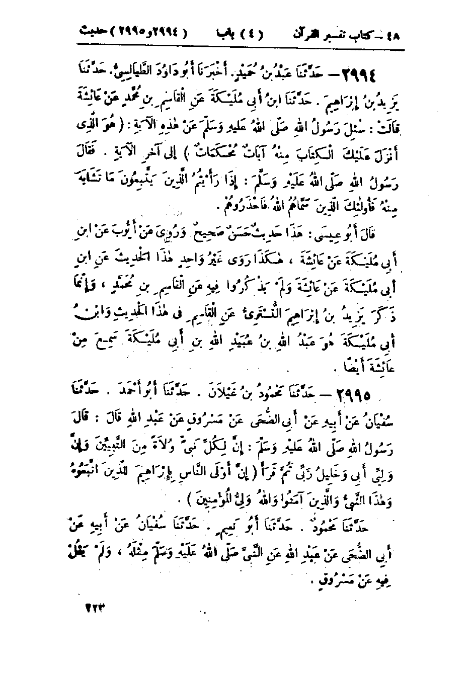 2994 - حَدَّثَنَا عَبْدُ بْنُ حُمَيْدٍ قَالَ: أَخْبَرَنَا أَبُو الوَلِيدِ الطَّيَالِسِيُّ قَالَ: حَدَّثَنَا يَزِيدُ بْنُ إِبْرَاهِيمَ قَالَ: حَدَّثَنَا ابْنُ أَبِي مُلَيْكَةَ، عَنْ القَاسِمِ بْنِ مُحَمَّدٍ، عَنْ عَائِشَةَ، قَالَتْ: سُئِلَ رَسُولُ اللَّهِ صَلَّى اللَّهُ عَلَيْهِ وَسَلَّمَ عَنْ هَذِهِ الآيَةِ {هُوَ الَّذِي أَنْزَلَ عَلَيْكَ الكِتَابَ مِنْهُ آيَاتٌ مُحْكَمَاتٌ} [آل عمران: 7] إِلَى آخِرِ الآيَةِ. فَقَالَ رَسُولُ اللَّهِ صَلَّى اللَّهُ عَلَيْهِ وَسَلَّمَ: «§إِذَا رَأَيْتُمُ الَّذِينَ يَتَّبِعُونَ مَا تَشَابَهَ مِنْهُ فَأُولَئِكَ الَّذِينَ سَمَّاهُمُ اللَّهُ فَاحْذَرُوهُمْ». «هَذَا حَدِيثٌ حَسَنٌ صَحِيحٌ». وَقَدْ رُوِيَ عَنْ أَيُّوبَ، عَنْ ابْنِ أَبِي مُلَيْكَةَ، عَنْ عَائِشَةَ، هَذَا الْحَدِيثُ، وَهَكَذَا رَوَى غَيْرُ وَاحِدٍ هَذَا الحَدِيثَ عَنْ ابْنِ أَبِي مُلَيْكَةَ، عَنْ عَائِشَةَ، وَلَمْ يَذْكُرُوا فِيهِ عَنِ القَاسِمِ بْنِ مُحَمَّدٍ، وَإِنَّمَا ذَكَرَهُ يَزِيدُ بْنُ إِبْرَاهِيمَ، عَنِ الْقَاسِمِ فِي هَذَا الحَدِيثِ. وَابْنُ أَبِي مُلَيْكَةَ هُوَ: عَبْدُ اللَّهِ بْنُ عُبَيْدِ اللَّهِ بْنِ أَبِي مُلَيْكَةَ وَقَدْ سَمِعَ مِنْ عَائِشَةَ أَيْضًا "