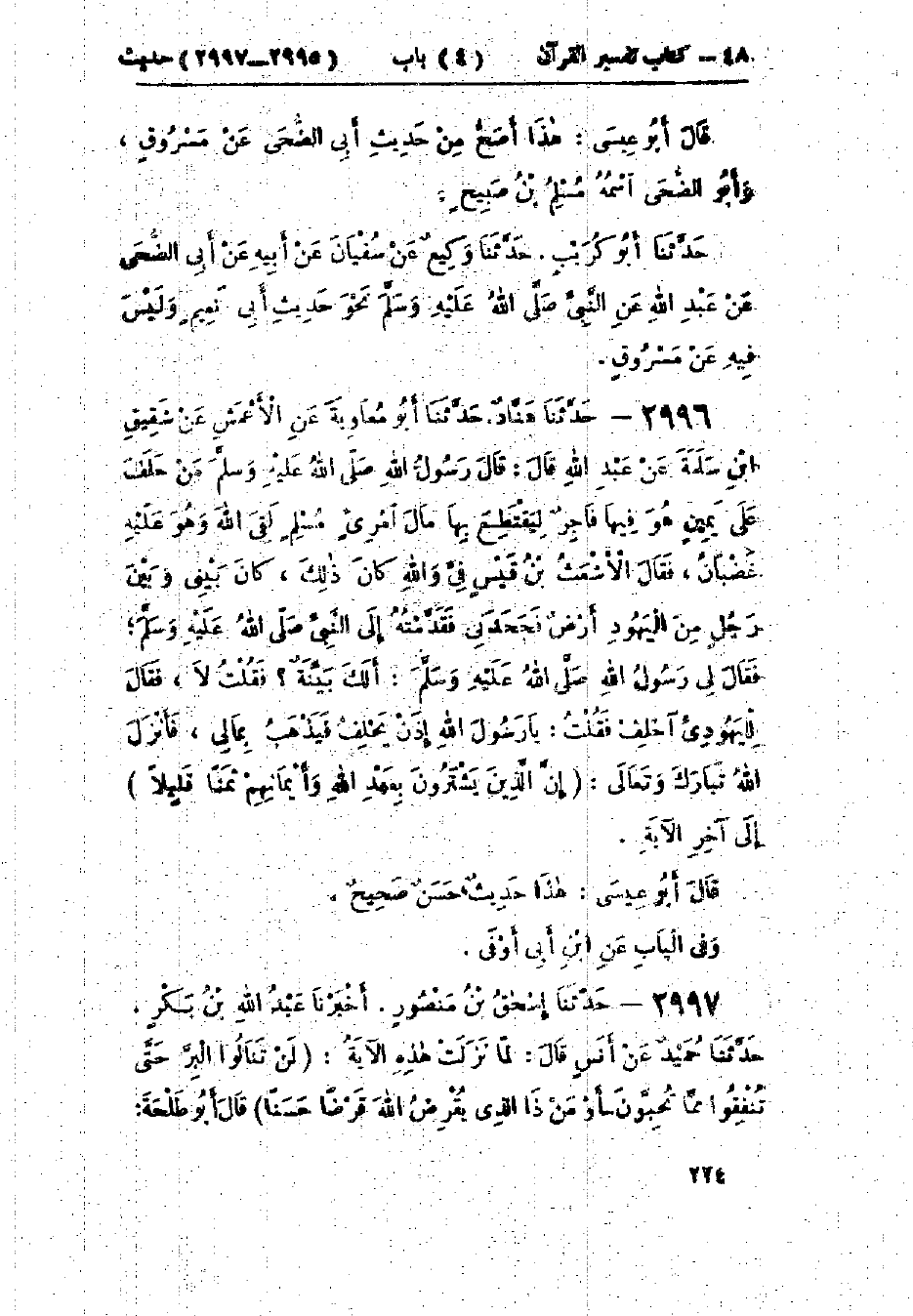 2996 - حَدَّثَنَا هَنَّادٌ قَالَ: حَدَّثَنَا أَبُو مُعَاوِيَةَ، عَنْ الأَعْمَشِ، عَنْ شَقِيقِ بْنِ سَلَمَةَ، عَنْ عَبْدِ اللَّهِ، قَالَ: قَالَ رَسُولُ اللَّهِ صَلَّى اللَّهُ عَلَيْهِ وَسَلَّمَ: «§مَنْ حَلَفَ عَلَى يَمِينٍ وَهُوَ فِيهَا فَاجِرٌ لِيَقْتَطِعَ بِهَا مَالَ امْرِئٍ مُسْلِمٍ، لَقِيَ اللَّهَ وَهُوَ عَلَيْهِ غَضْبَانُ»، فَقَالَ الأَشْعَثُ بْنُ قَيْسٍ: فِيَّ وَاللَّهِ كَانَ ذَلِكَ، كَانَ بَيْنِي وَبَيْنَ رَجُلٍ مِنَ اليَهُودِ أَرْضٌ فَجَحَدَنِي، فَقَدَّمْتُهُ إِلَى النَّبِيِّ صَلَّى اللَّهُ عَلَيْهِ وَسَلَّمَ، فَقَالَ لِي رَسُولُ اللَّهِ صَلَّى اللَّهُ عَلَيْهِ وَسَلَّمَ: «أَلَكَ بَيِّنَةٌ»؟ فَقُلْتُ: لَا، فَقَالَ لِلْيَهُودِيِّ: «احْلِفْ» فَقُلْتُ: يَا رَسُولَ اللَّهِ إِذَنْ يَحْلِفُ فَيَذْهَبُ بِمَالِي، فَأَنْزَلَ اللَّهُ تَبَارَكَ وَتَعَالَى: {إِنَّ الَّذِينَ يَشْتَرُونَ بِعَهْدِ اللَّهِ وَأَيْمَانِهِمْ ثَمَنًا قَلِيلًا} [آل عمران: 77] إِلَى آخِرِ الآيَةِ: «هَذَا حَدِيثٌ حَسَنٌ صَحِيحٌ» وَفِي البَابِ عَنْ ابْنِ أَبِي أَوْفَى