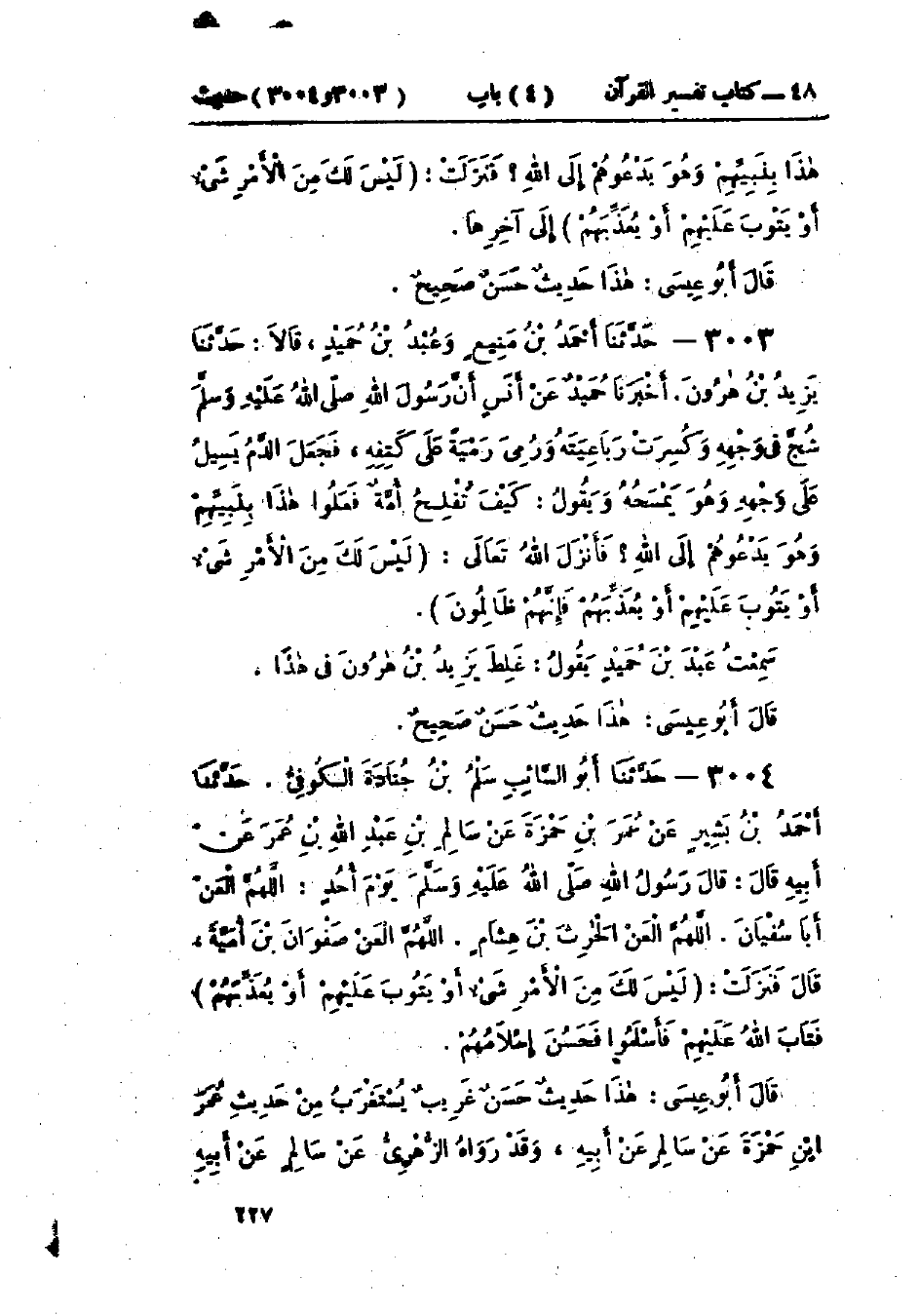 3003 - حَدَّثَنَا أَحْمَدُ بْنُ مَنِيعٍ، وَعَبْدُ بْنُ حُمَيْدٍ، قَالَا: حَدَّثَنَا يَزِيدُ بْنُ هَارُونَ قَالَ: أَخْبَرَنَا حُمَيْدٌ، عَنْ أَنَسٍ، أَنَّ رَسُولَ اللَّهِ صَلَّى اللَّهُ عَلَيْهِ وَسَلَّمَ شُجَّ فِي وَجْهِهِ وَكُسِرَتْ رَبَاعِيَتُهُ وَرُمِيَ رَمْيَةً عَلَى كَتِفِهِ، فَجَعَلَ الدَّمُ يَسِيلُ عَلَى وَجْهِهِ، وَهُوَ يَمْسَحُهُ وَيَقُولُ: «§كَيْفَ تُفْلِحُ أُمَّةٌ فَعَلُوا هَذَا بِنَبِيِّهِمْ وَهُوَ يَدْعُوهُمْ إِلَى اللَّهِ؟» فَأَنْزَلَ اللَّهُ تَعَالَى: {لَيْسَ لَكَ مِنَ الأَمْرِ شَيْءٌ أَوْ يَتُوبَ عَلَيْهِمْ أَوْ يُعَذِّبَهُمْ فَإِنَّهُمْ ظَالِمُونَ} [آل عمران: 128] " سَمِعْت عَبْدَ بْنَ حُمَيْدٍ يَقُولُ: غَلِطَ يَزِيدُ بْنُ هَارُونَ فِي هَذَا ".: «هَذَا حَدِيثٌ حَسَنٌ صَحِيحٌ»