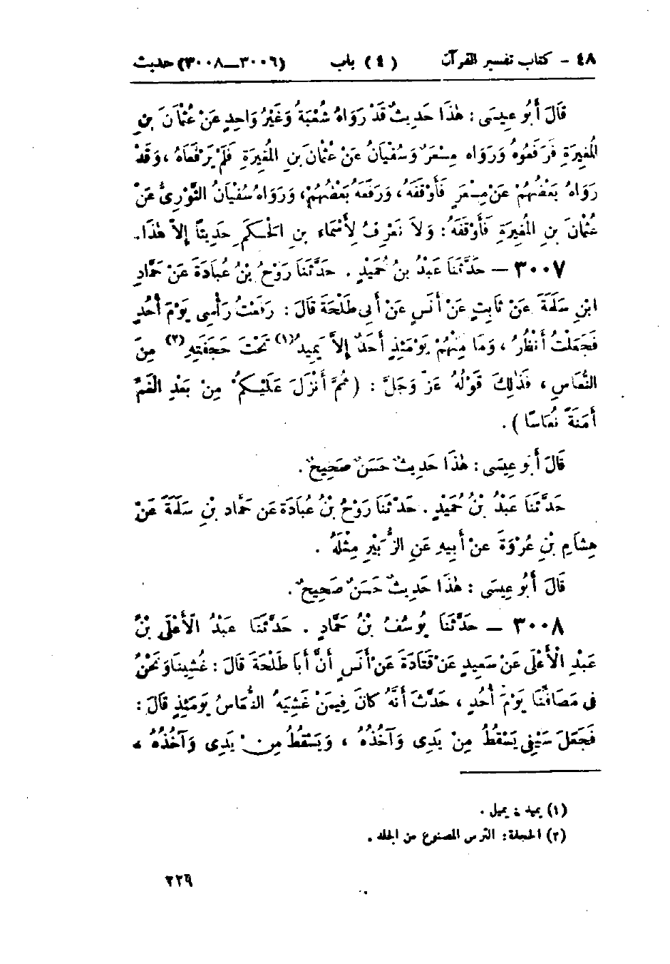 3007 - حَدَّثَنَا عَبْدُ بْنُ حُمَيْدٍ قَالَ: حَدَّثَنَا رَوْحُ بْنُ عُبَادَةَ، عَنْ حَمَّادِ بْنِ سَلَمَةَ، عَنْ ثَابِتٍ، عَنْ أَنَسٍ، عَنْ أَبِي طَلْحَةَ، قَالَ: «§رَفَعْتُ رَأْسِي يَوْمَ أُحُدٍ فَجَعَلْتُ أَنْظُرُ، وَمَا مِنْهُمْ يَوْمَئِذٍ أَحَدٌ إِلَّا يَمِيدُ تَحْتَ حَجَفَتِهِ مِنَ النُّعَاسِ»، فَذَلِكَ قَوْلُهُ عَزَّ وَجَلَّ: {ثُمَّ أَنْزَلَ عَلَيْكُمْ مِنْ بَعْدِ الغَمِّ أَمَنَةً نُعَاسًا} [آل عمران: 154]: «هَذَا حَدِيثٌ حَسَنٌ صَحِيحٌ» حَدَّثَنَا عَبْدُ بْنُ حُمَيْدٍ قَالَ: حَدَّثَنَا رَوْحُ بْنُ عَبَادَةَ، عَنْ حَمَّادِ بْنِ سَلَمَةَ، عَنْ هِشَامِ بْنِ عُرْوَةَ، عَنْ أَبِيهِ، عَنِ الزُّبَيْرِ، مِثْلَهُ،: «هَذَا حَدِيثٌ حَسَنٌ صَحِيحٌ»