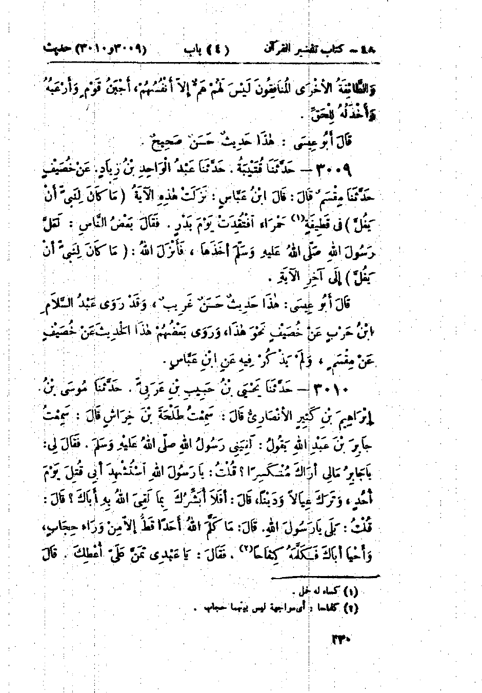 3009 - حَدَّثَنَا قُتَيْبَةُ قَالَ: حَدَّثَنَا عَبْدُ الوَاحِدِ بْنُ زِيَادٍ، عَنْ خُصَيْفٍ قَالَ: حَدَّثَنَا مِقْسَمٌ، قَالَ: قَالَ ابْنُ عَبَّاسٍ: " نَزَلَتْ هَذِهِ الآيَةَ {§وَمَا كَانَ لِنَبِيٍّ أَنْ يَغُلَّ} [آل عمران: 161] فِي قَطِيفَةٍ حَمْرَاءَ افْتُقِدَتْ يَوْمَ بَدْرٍ. فَقَالَ بَعْضُ النَّاسِ: لَعَلَّ رَسُولَ اللَّهِ صَلَّى اللَّهُ عَلَيْهِ وَسَلَّمَ أَخَذَهَا، فَأَنْزَلَ اللَّهُ تَبَارَكَ وَتَعَالَى: {مَا كَانَ لِنَبِيٍّ أَنْ يَغُلَّ} [آل عمران: 161] إِلَى آخِرِ الآيَةِ: «هَذَا حَدِيثٌ حَسَنٌ غَرِيبٌ» وَقَدْ رَوَى عَبْدُ السَّلَامِ بْنُ حَرْبٍ، عَنْ خُصَيْفٍ، نَحْوَ هَذَا وَرَوَى بَعْضُهُمْ هَذَا الحَدِيثَ عَنْ خُصَيْفٍ، عَنْ مِقْسَمٍ، وَلَمْ يَذْكُرْ فِيهِ عَنْ ابْنِ عَبَّاسٍ